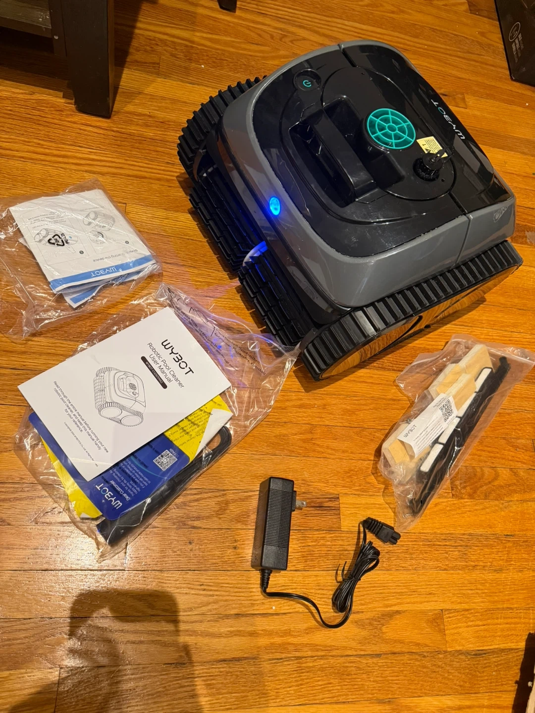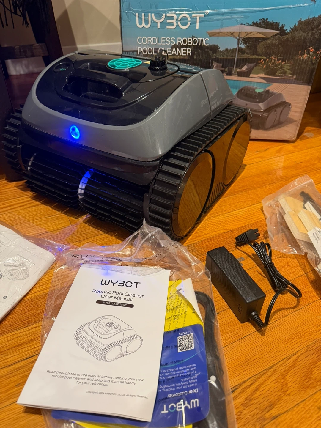 WYBOT cordless robotic pool cleaner with charging cable and accessories. Includes user manual. It's designed for efficient pool cleaning.