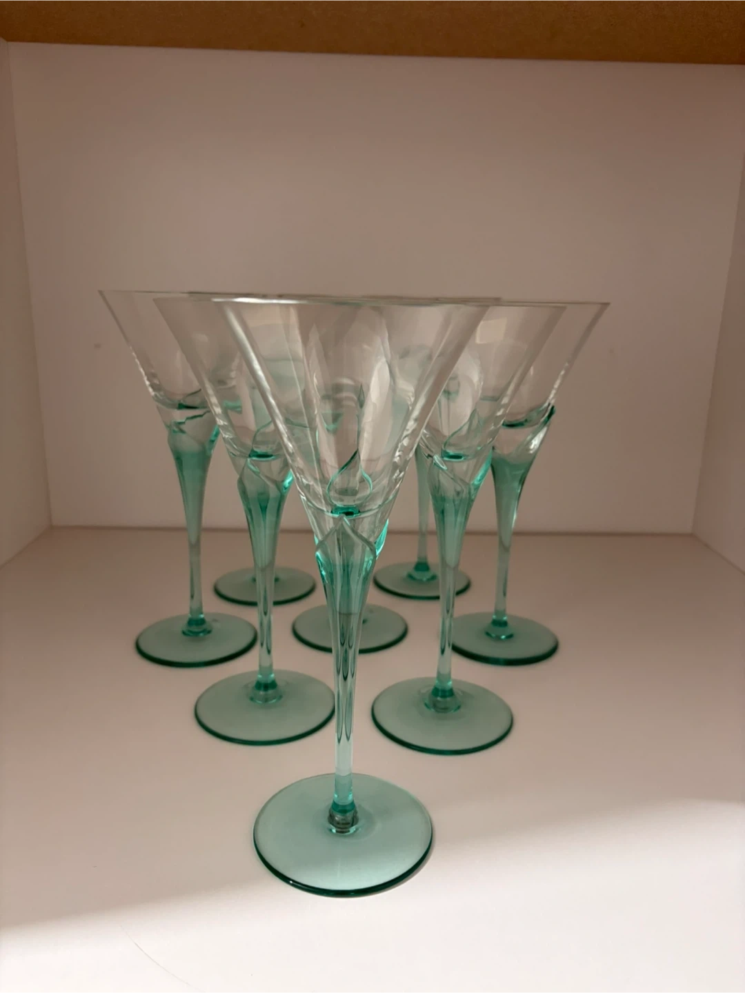 Set of eight Mikasa crystal martini glasses with teal stems and bases. These elegant glasses have a unique twisted stem design. Perfect for serving cocktails at your next gathering!