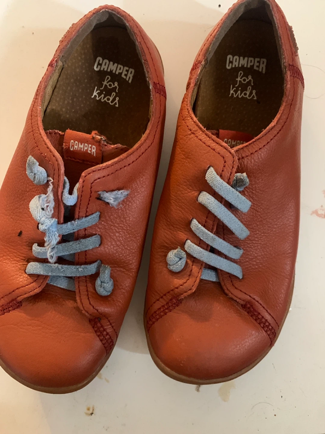 Selling a pair of Camper kids shoes in orange leather. They show some signs of wear but are still in good condition for everyday use