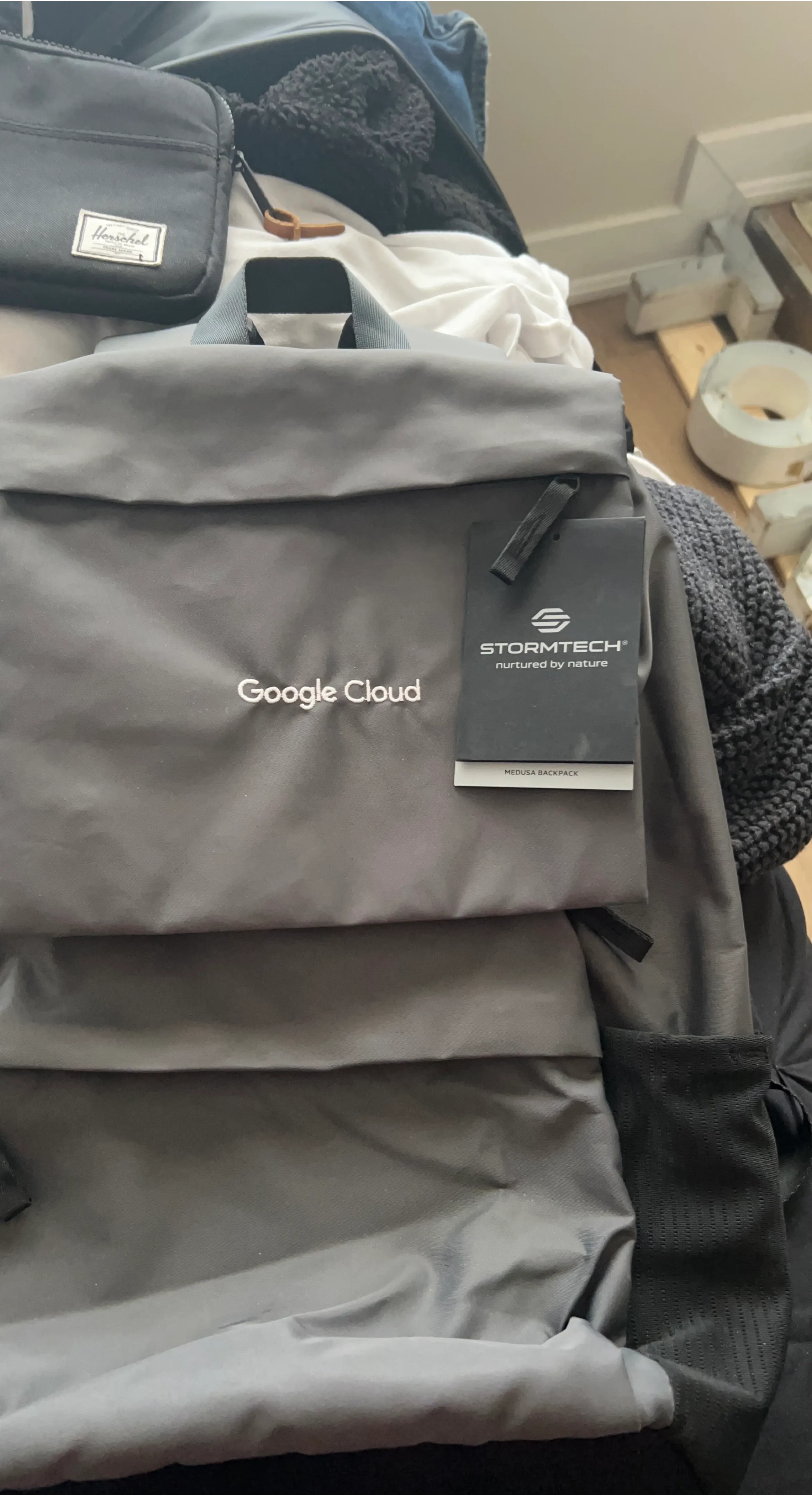 This is a Stormtech Medusa backpack. It features the Google Cloud logo embroidered on the front. The backpack is grey and is brand new with tags .