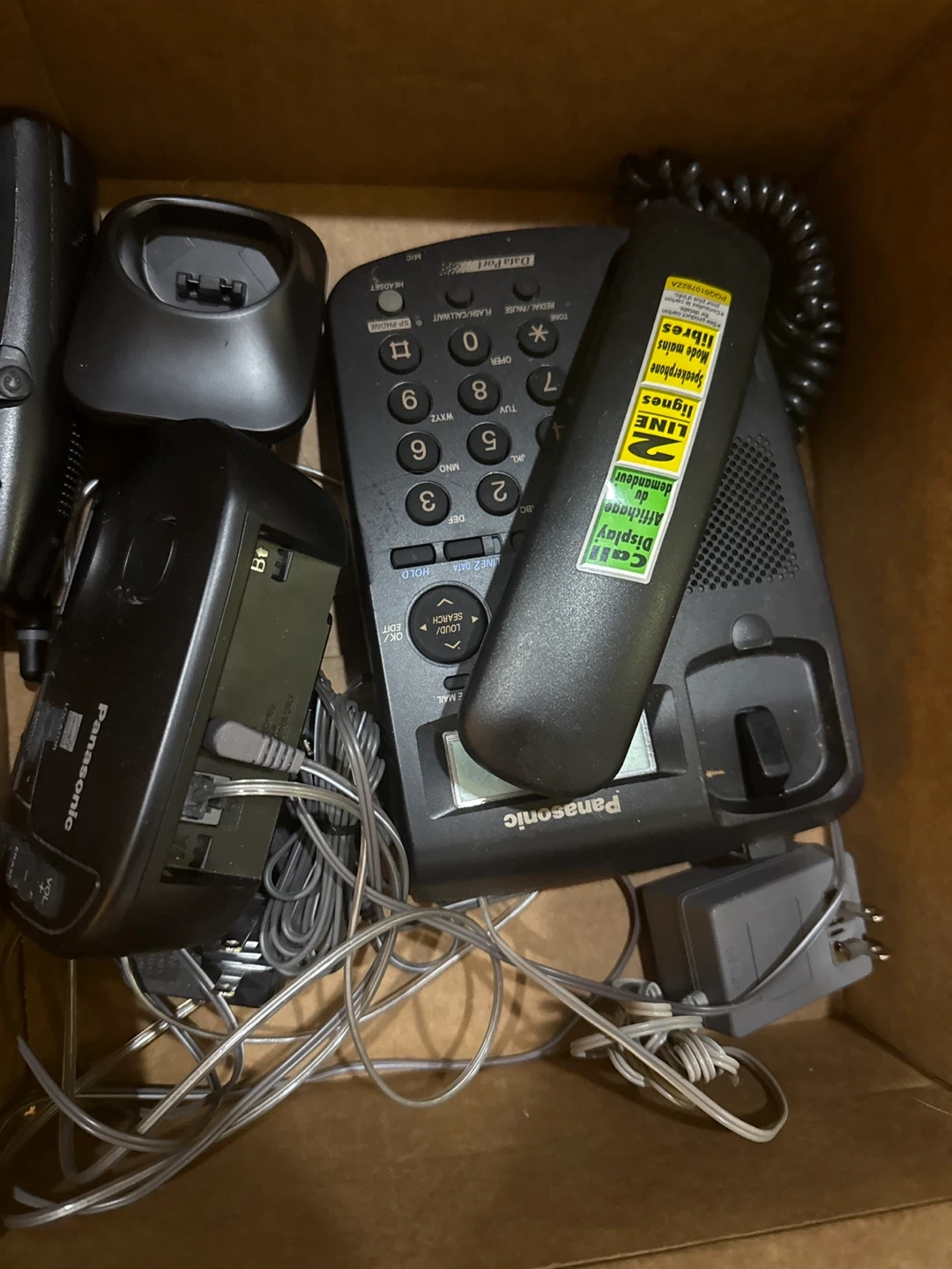 This Panasonic cordless speakerphone system includes a base unit, handset, and power adapter. It features a display for caller ID and a speakerphone function. The system supports two lines.
