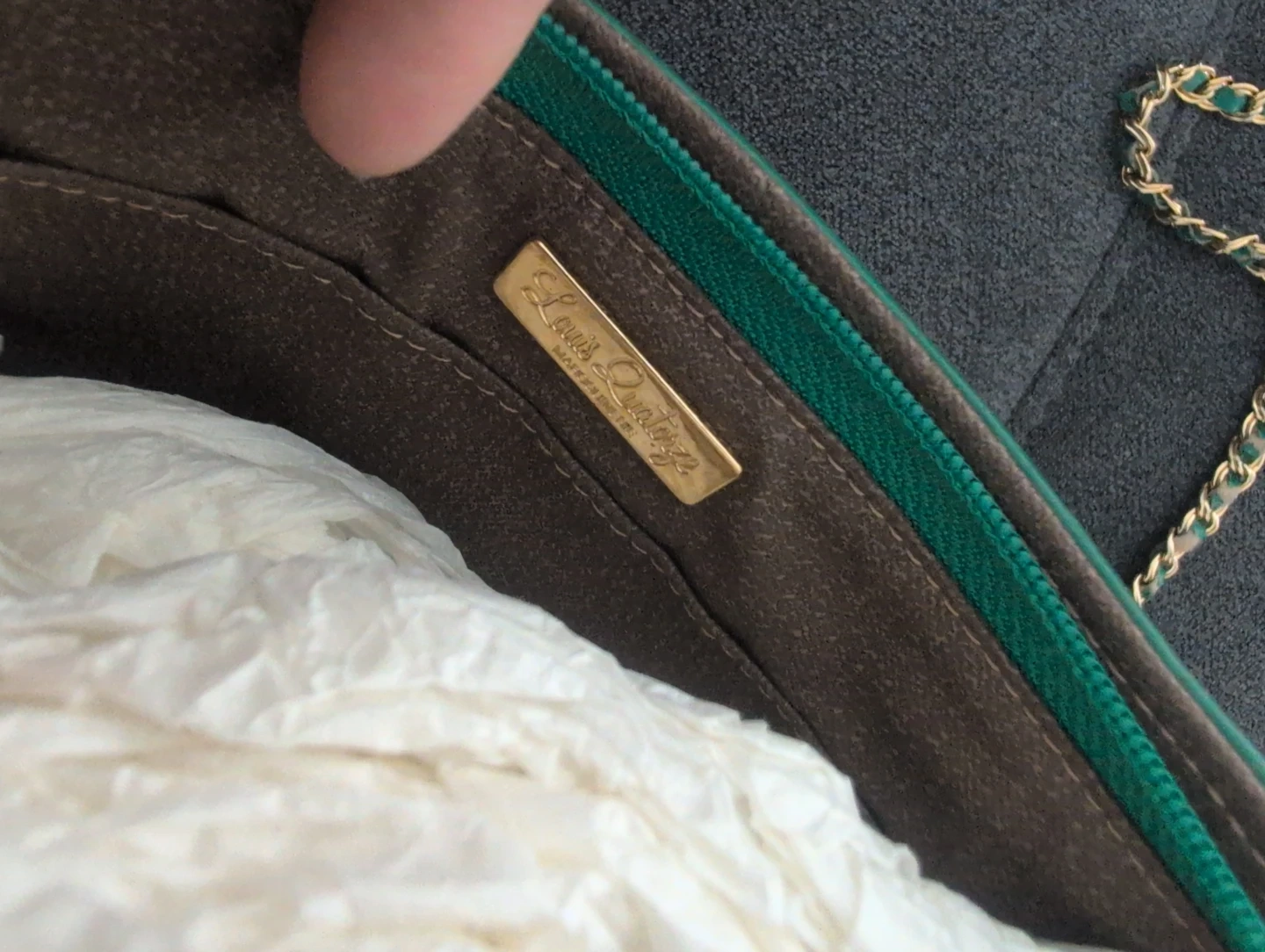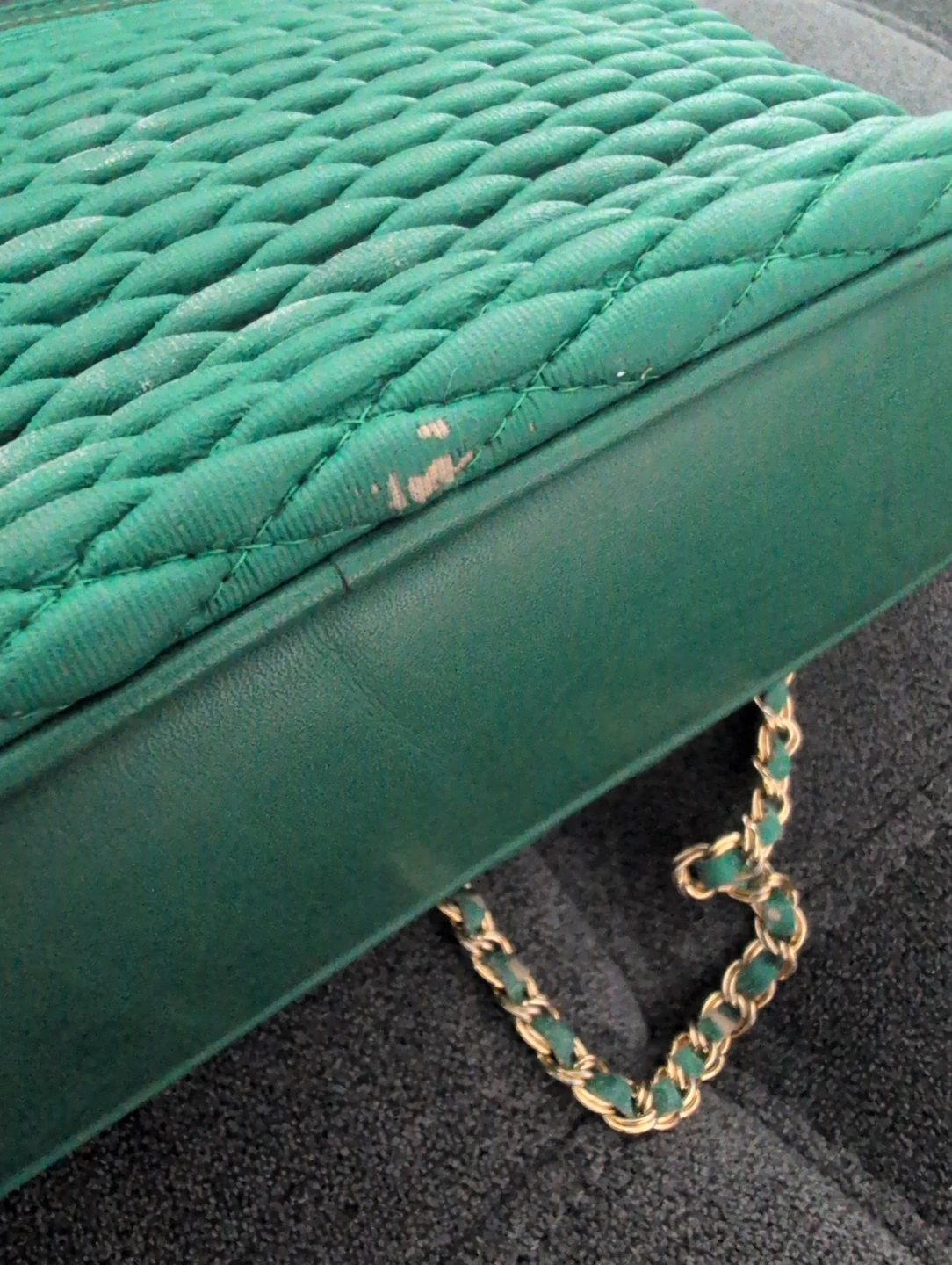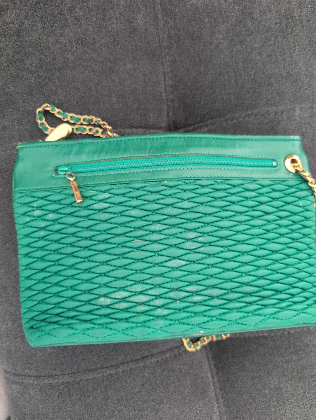 A beautiful Emerald Green Louis Quatorze (French luxury brand) shoulder bag with a gold chain strap. It features a quilted exterior and both an inner and outer zippered pocket. Some minor scuffs are visible on the exterior - this bag was pre-loved by my mother.
