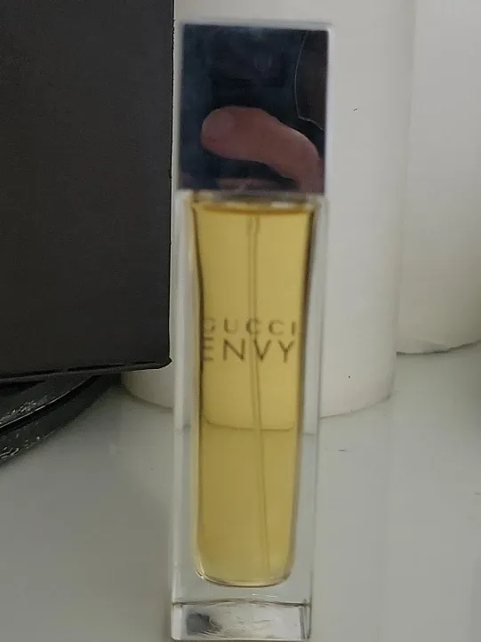 This is a bottle of Gucci Envy Eau de Toilette. It's a classic scent. The bottle is clear glass with silver accents.