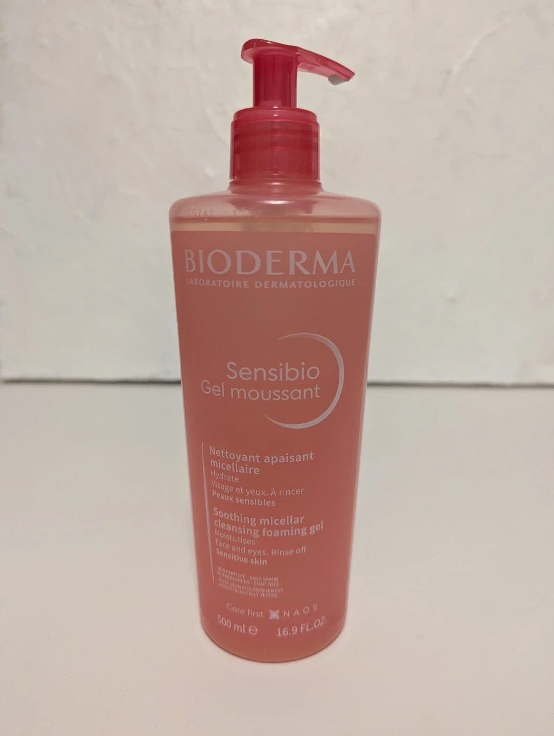 Bioderma Sensibio Soothing micellar cleansing foaming gel. It's fragrance and soap-free, designed for sensitive skin. 500 ml or 16.9 fl. oz. size. This gel moisturizes while cleansing the face and eyes.