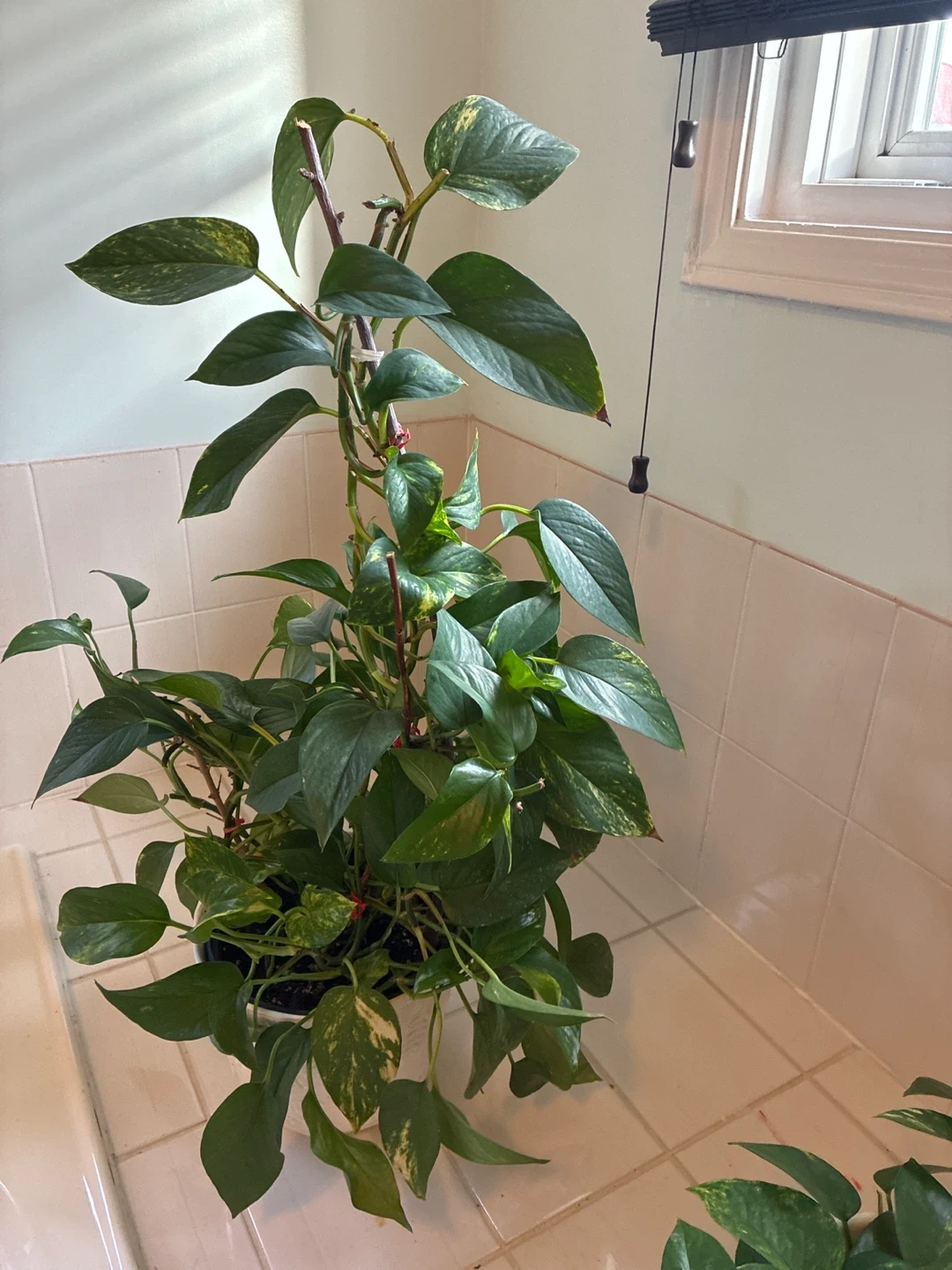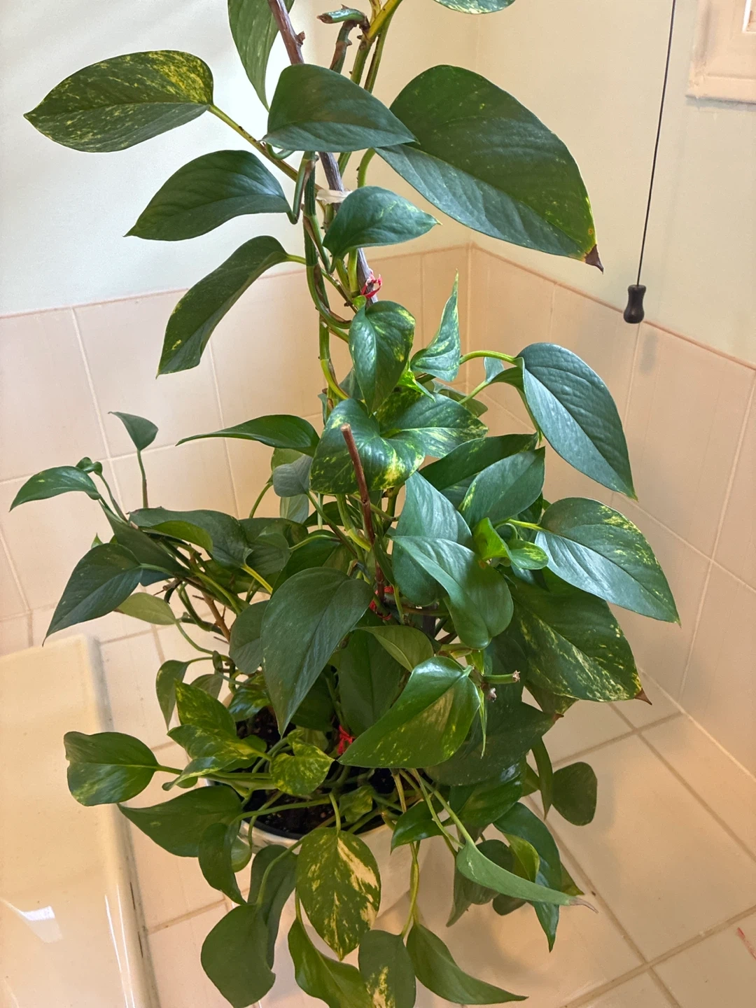 A lush Pothos plant featuring variegated green and yellow leaves. It's potted in a decorative white ribbed planter. This plant adds a touch of greenery to any indoor space. Its vines can trail or climb, making it versatile for decor!