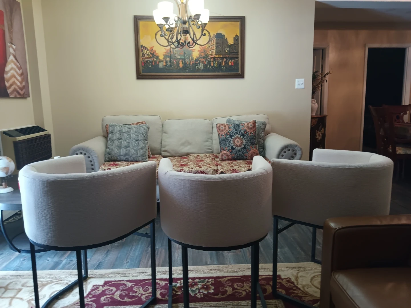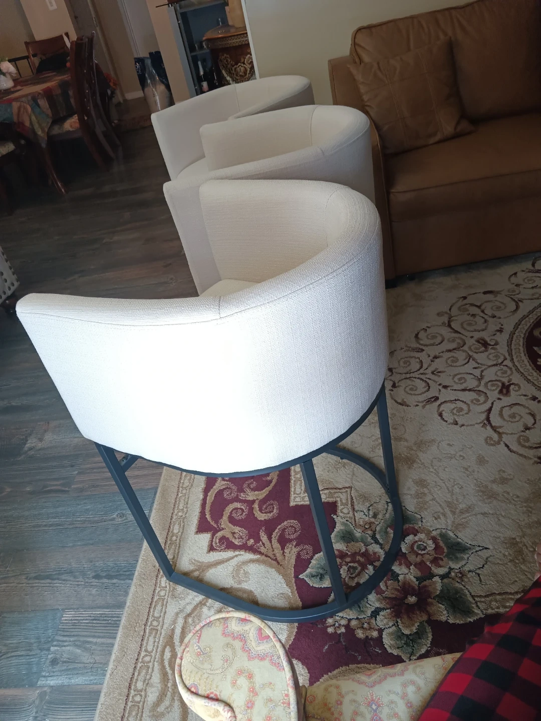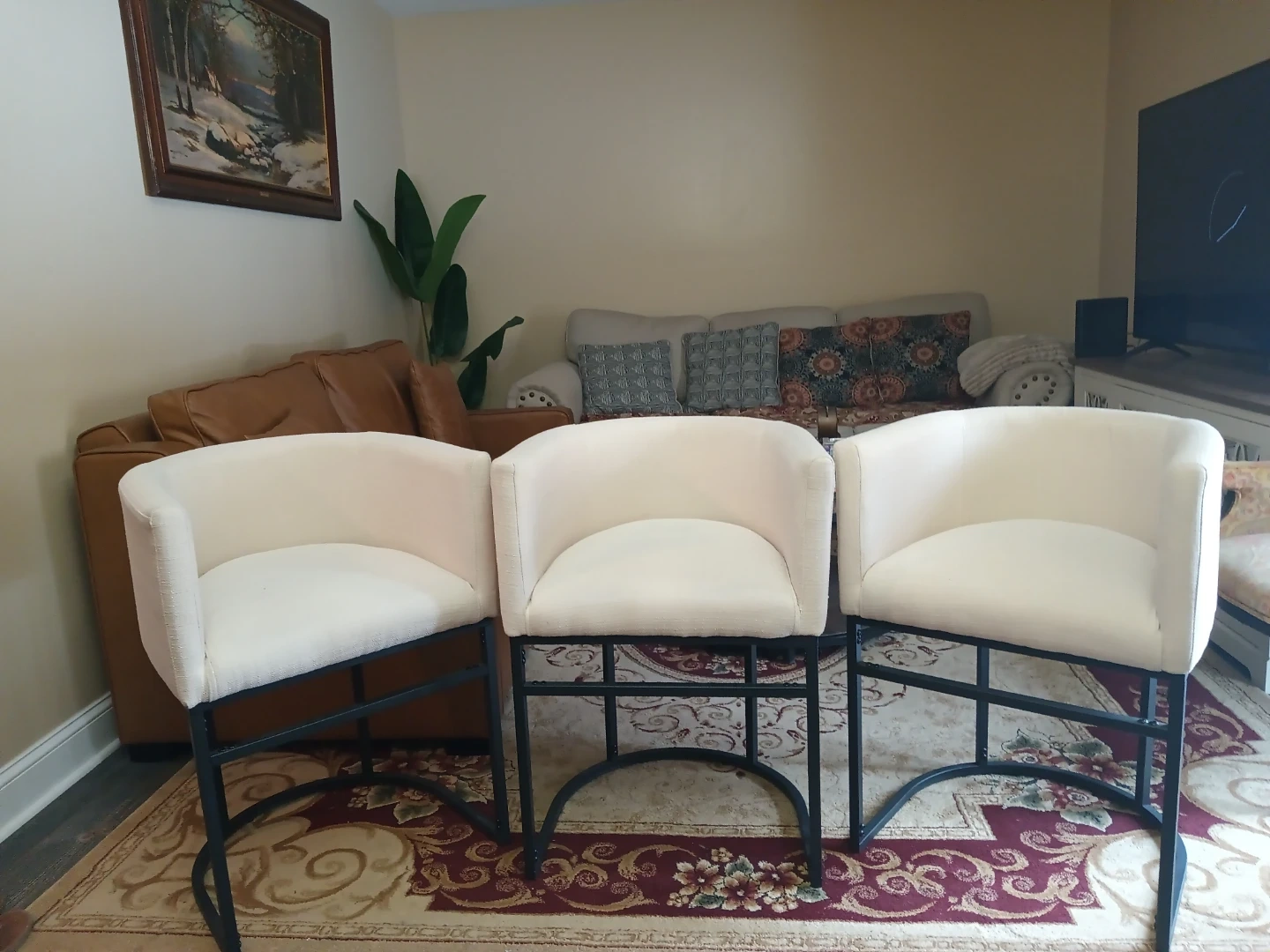 Three cream upholstered counter stools with a curved back and metal base. Upholstery appears to be a textured fabric. These stools offer a comfortable seating option. Ideal for a kitchen island or bar area. All three for 200. We are open to offers! #cleanout