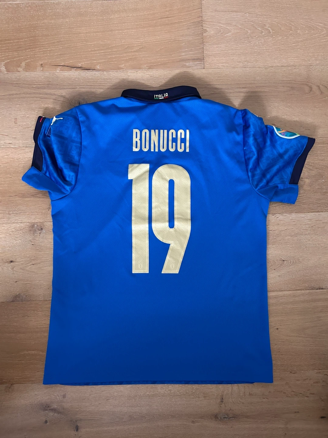 This is a Puma Italy National Football Team jersey, featuring Bonucci and the number 19. It's a men's size L, made with DryCELL technology for moisture-wicking. This jersey commemorates UEFA European Championship 2020.
