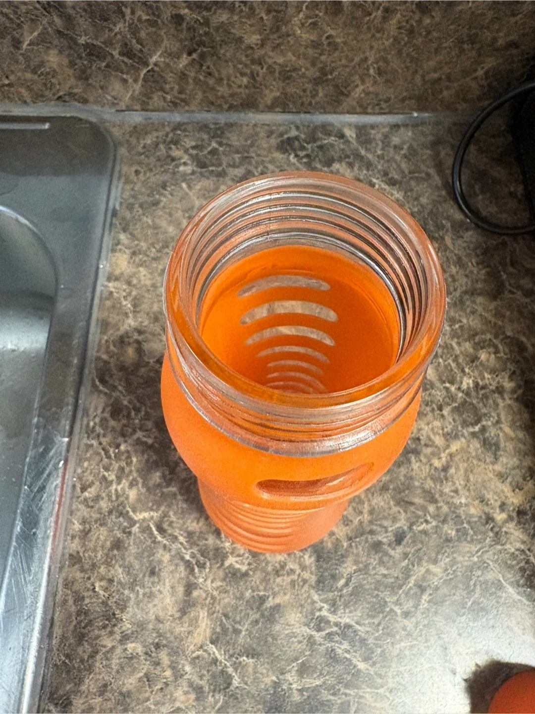 This is an orange water bottle with a glass interior and a silicone protective sleeve. It features a white carrying handle on top. This bottle is great for staying hydrated on the go!