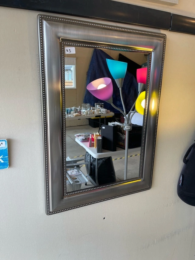 This is a stylish silver-framed mirror that would be perfect for any room in your home! It's in good condition and ready to hang. Measures 17” x 24”. Cash accepted.