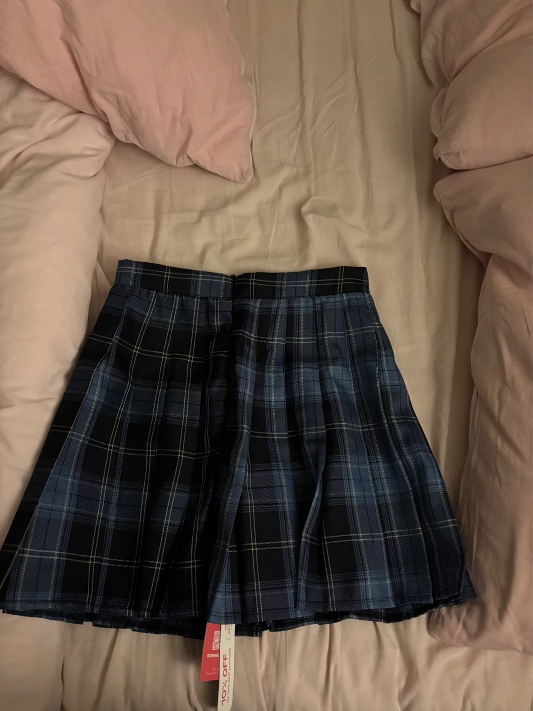 A blue and black plaid pleated mini skirt. It has a zipper closure at the back. This skirt is perfect for creating a classic academic look.
