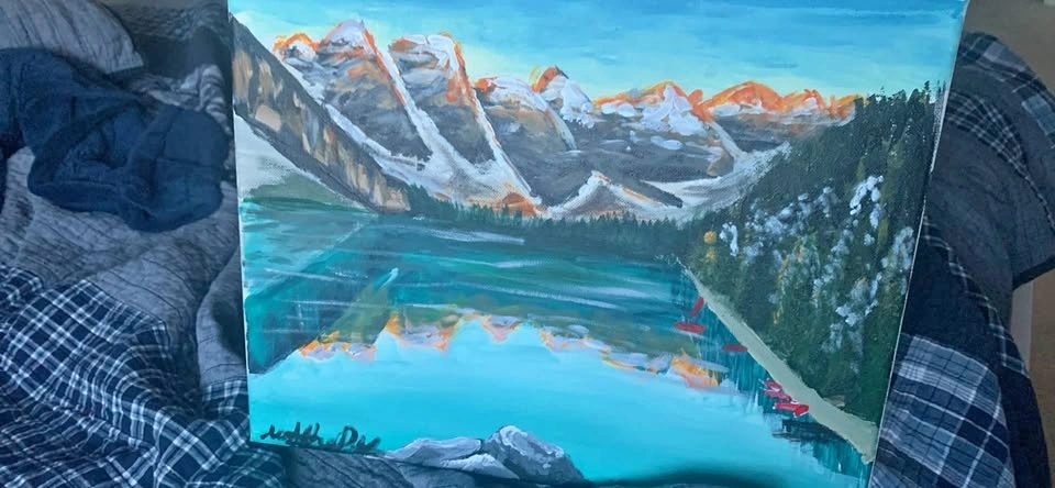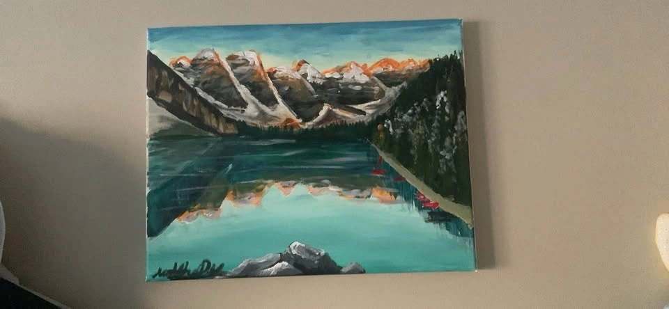 Original one-of-a-kind acrylic landscape inspired by Moraine Lake. The peace this piece captures the warm glow of sunrise hitting snow-covered peaks reflected across the still turquoise lake. The layered texture is rich for tones and vivid highlights, creating depth and movement, making it a strong focal point in any space.