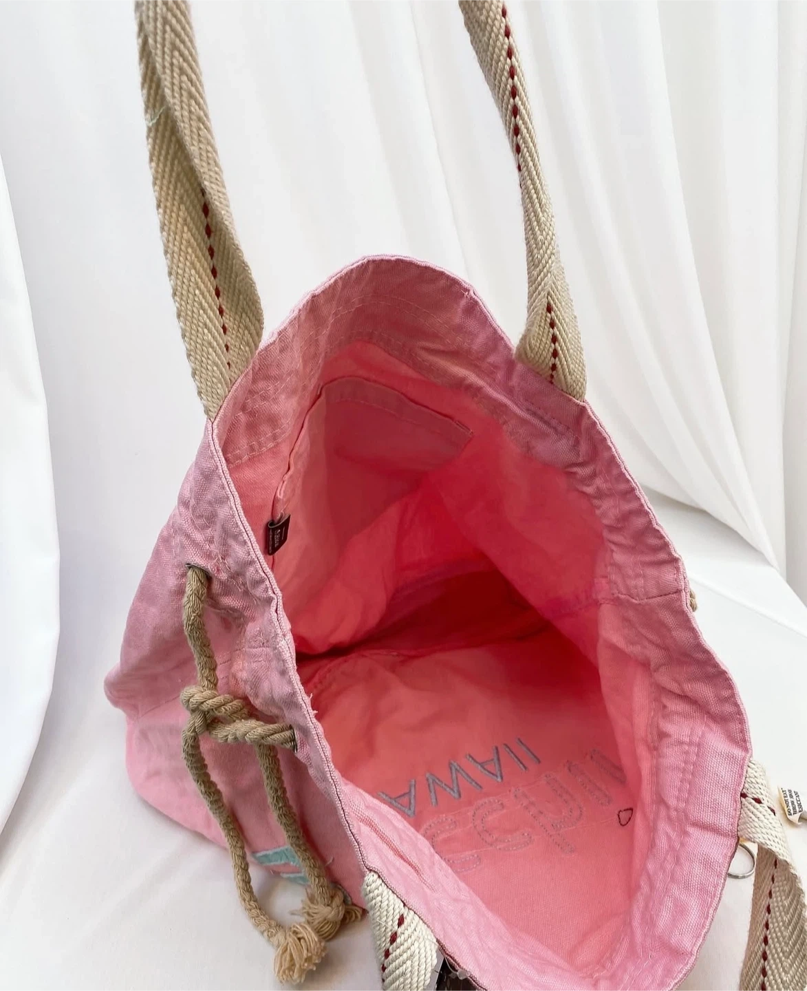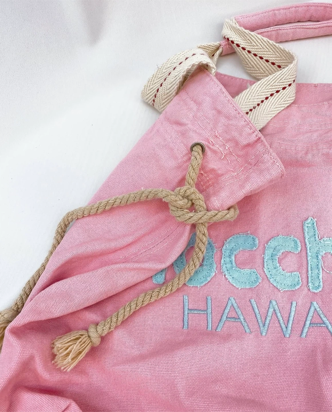 A stylish and functional Mocchin Hawaii embroidered tote bag made from durable canvas, designed with rope drawstring details and sturdy woven shoulder straps. This versatile eco-friendly bag is perfect for daily use, beach trips, travel, or shopping. Its lightweight yet spacious design makes it an ideal companion for casual wear, vacation outfits, or carrying essentials on the go.