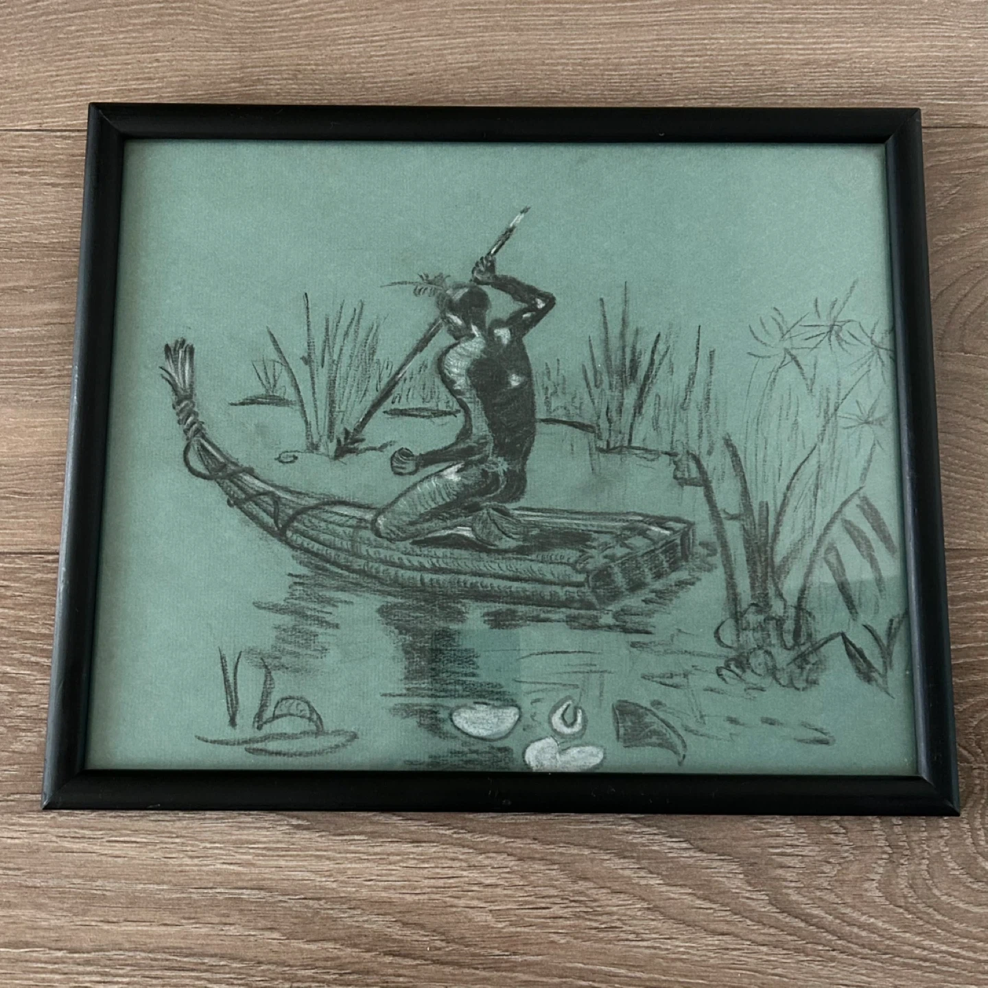 Striking vintage charcoal drawing with subtle white chalk highlights, executed on muted teal/green toned Canson & Montgolfier Ingres artist paper. The composition depicts a solitary figure navigating a traditional reed boat through papyrus plants and floating lily pads, creating a calm yet evocative river scene.