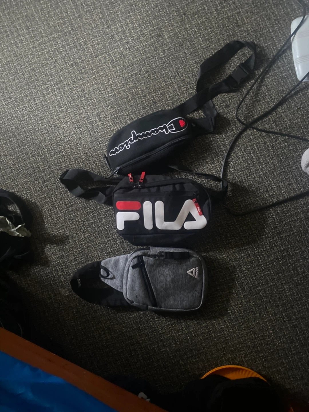 Bundle of three waist bags featuring Champion, Fila, and Reebok brands. The Champion bag is black with white lettering. The Fila bag is black with large white and red Fila logo. The Reebok bag is grey with a zipped pocket.
