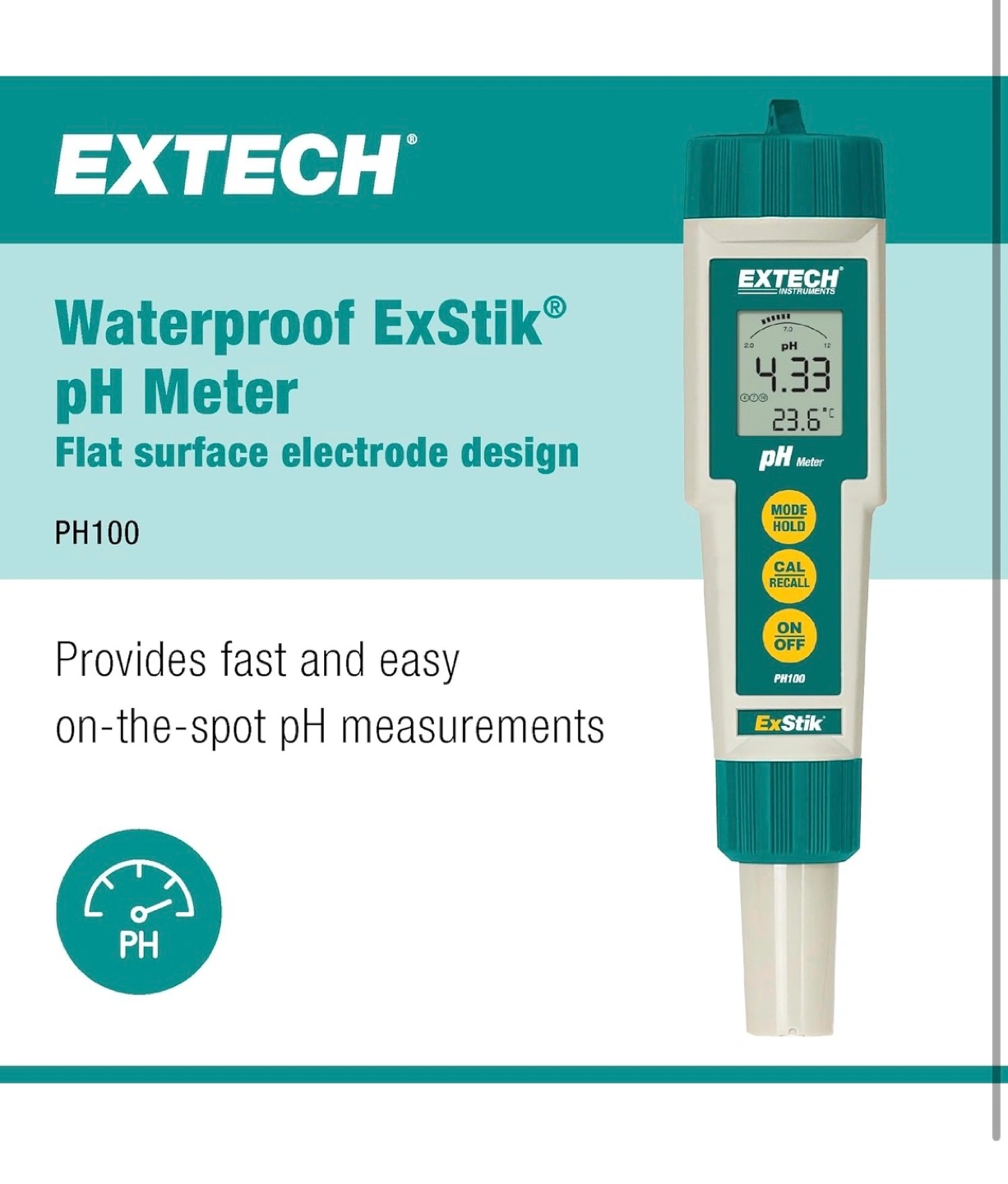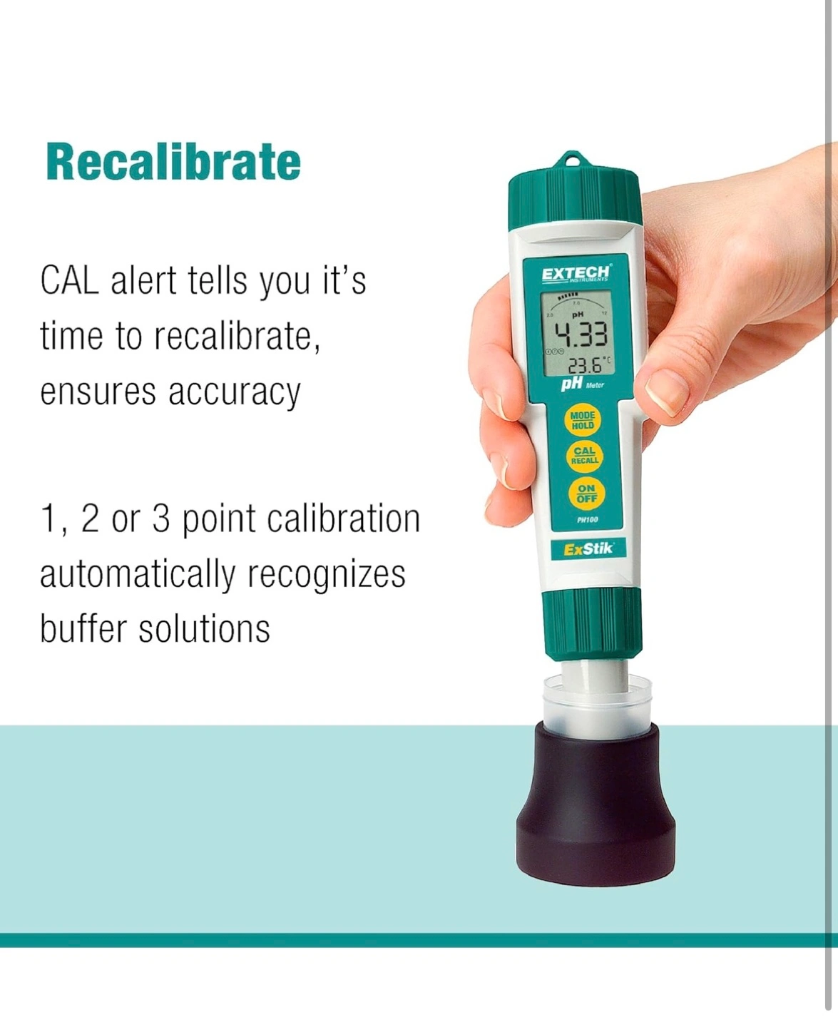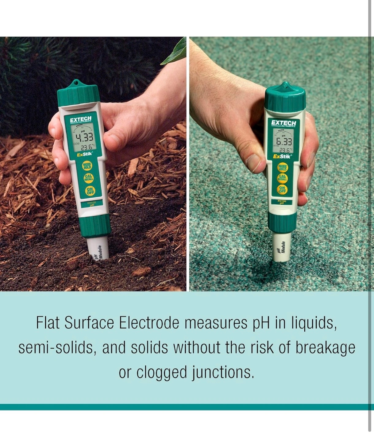 Waterproof pH meter, flat surface electrode design. Provides fast and easy on-the-spot pH measurements. 1, 2, or 3 point calibration automatically recognizes buffer solutions.