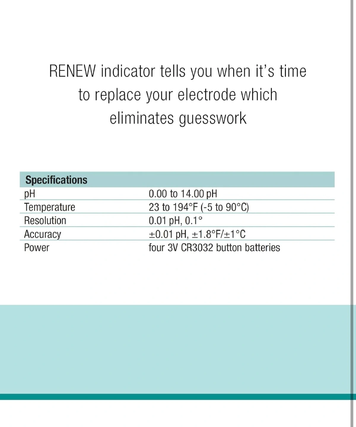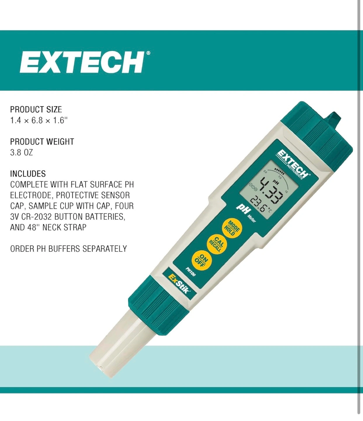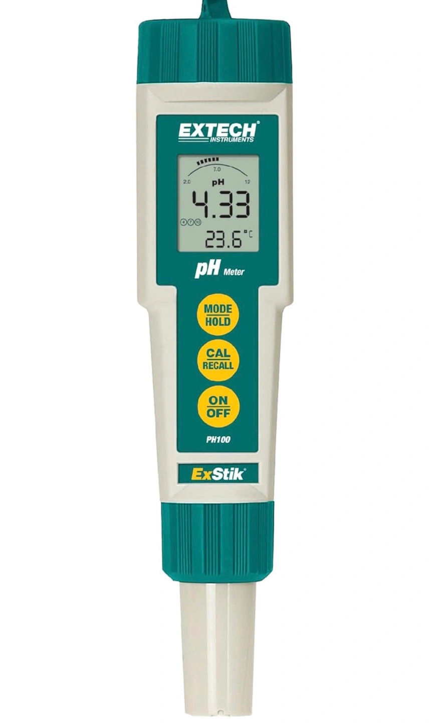 Waterproof pH meter, flat surface electrode design. Provides fast and easy on-the-spot pH measurements. 1, 2, or 3 point calibration automatically recognizes buffer solutions.