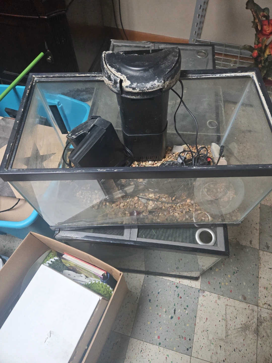 This is a glass aquarium tank with an attached filter and gravel. It's a standard aquarium setup. The tank is made of glass. It comes with an internal filter unit. Gravel is included in the tank.