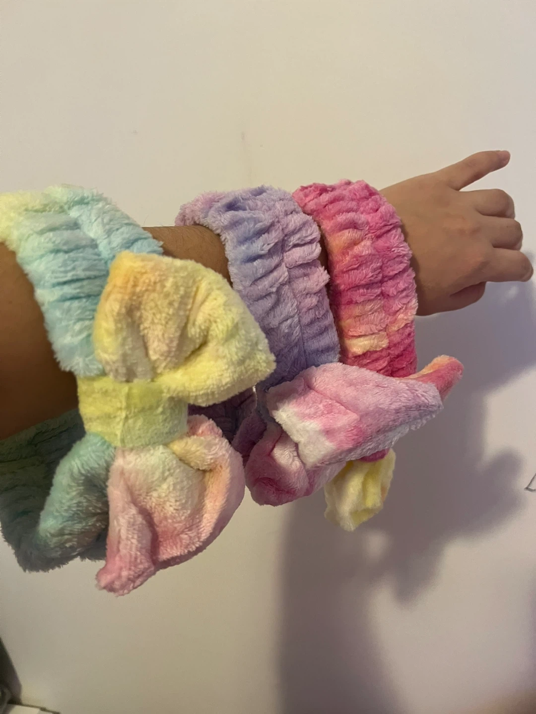 Four fuzzy tie-dye headbands, each with a cute bow accent. They're made of soft plush material. Great for keeping hair back during skincare routines! $3 each