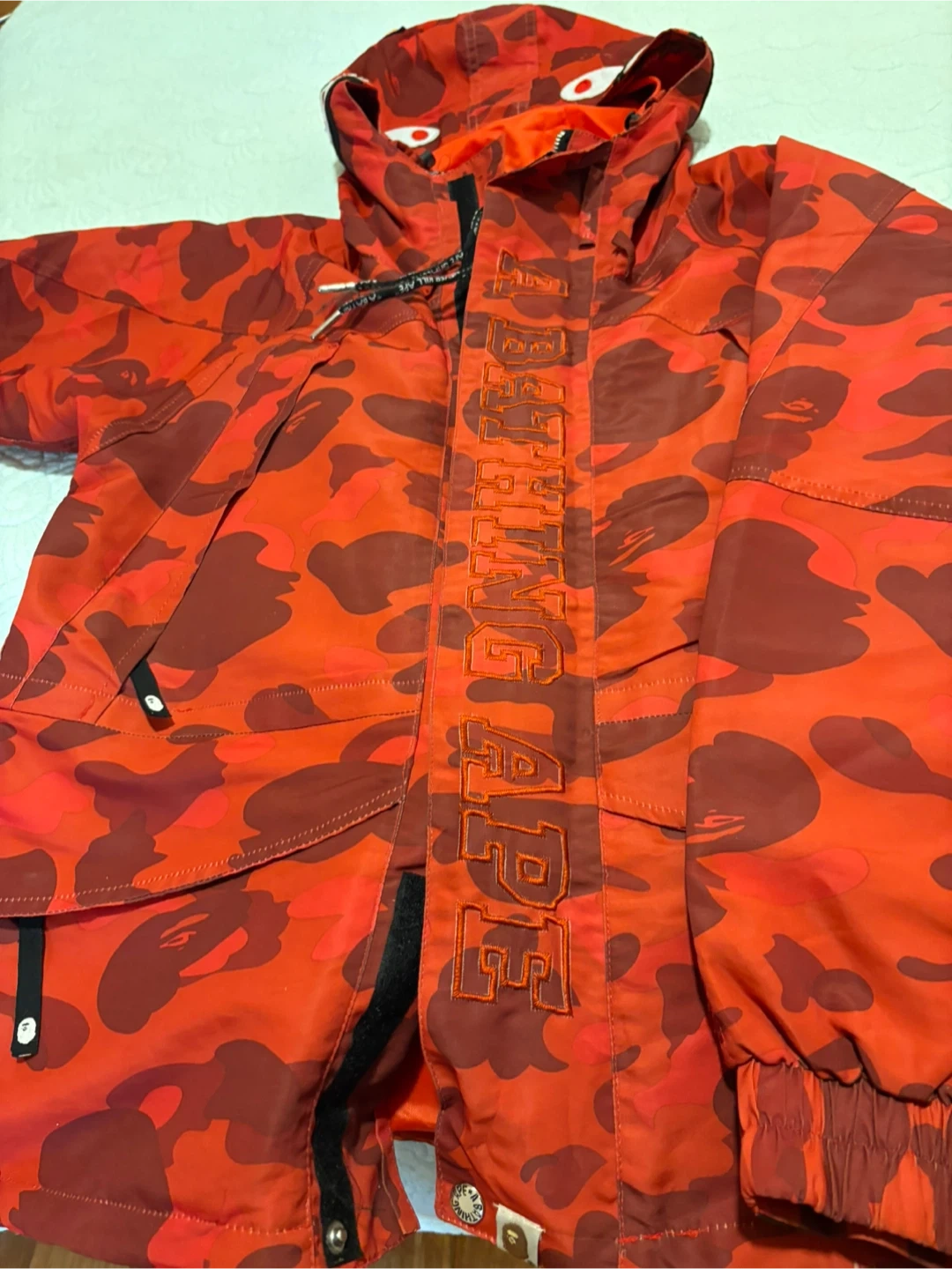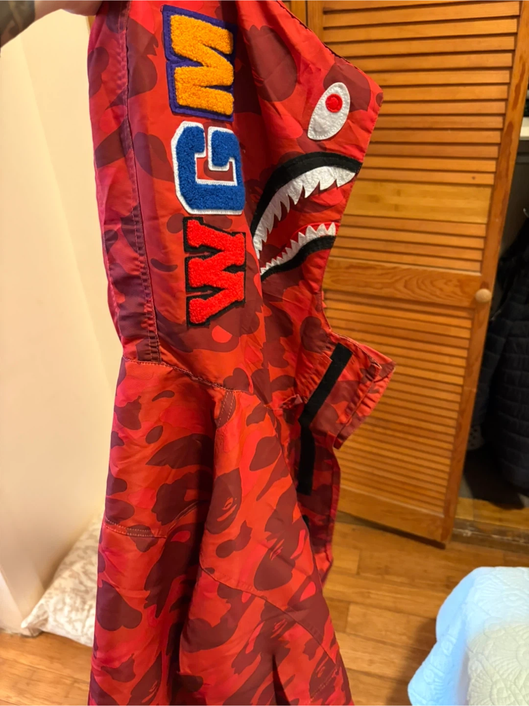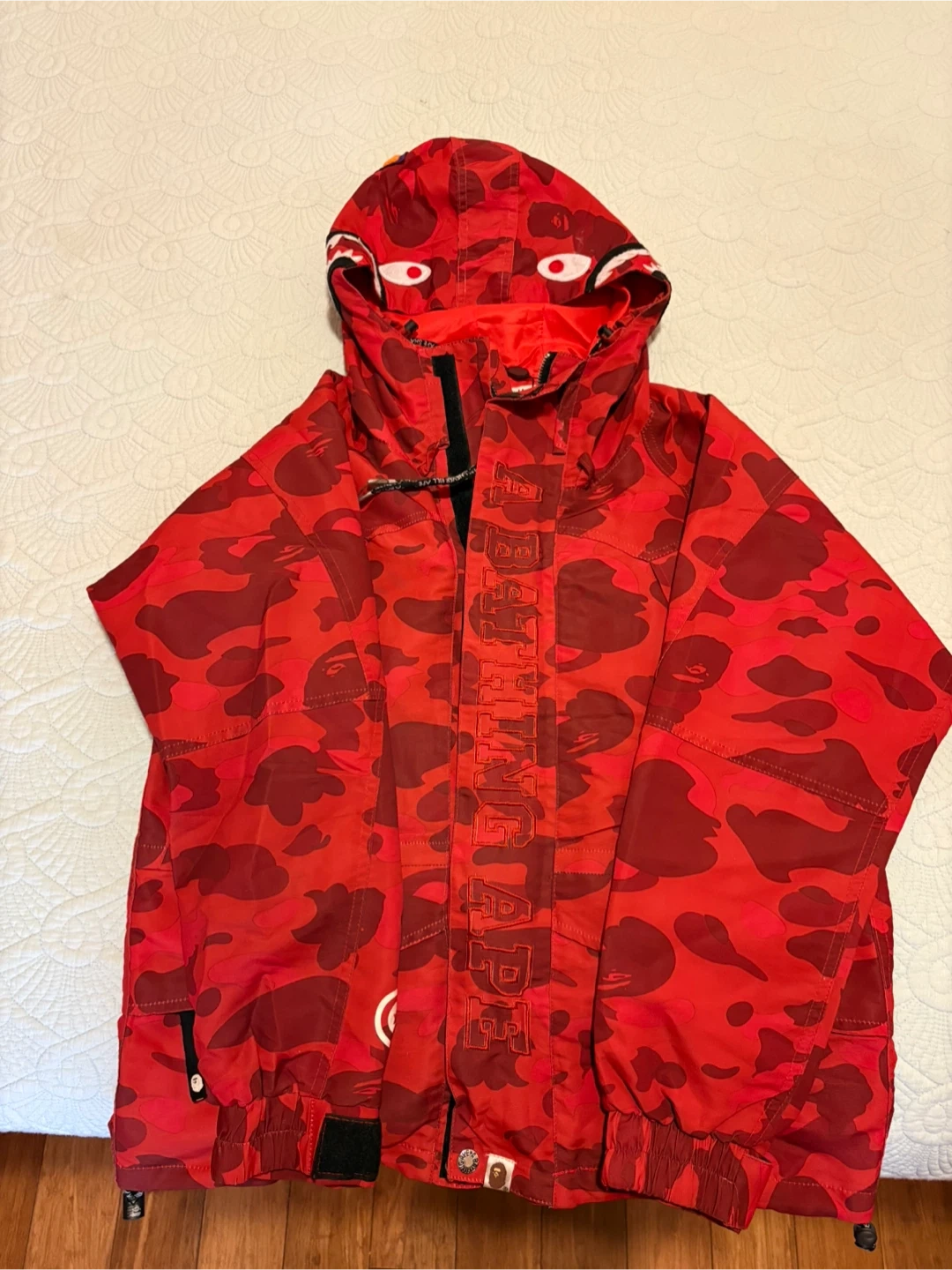 This A Bathing Ape hoodie features the iconic red camouflage pattern and shark face design. It's a size medium with a full zip front. Great for layering in cooler weather!
