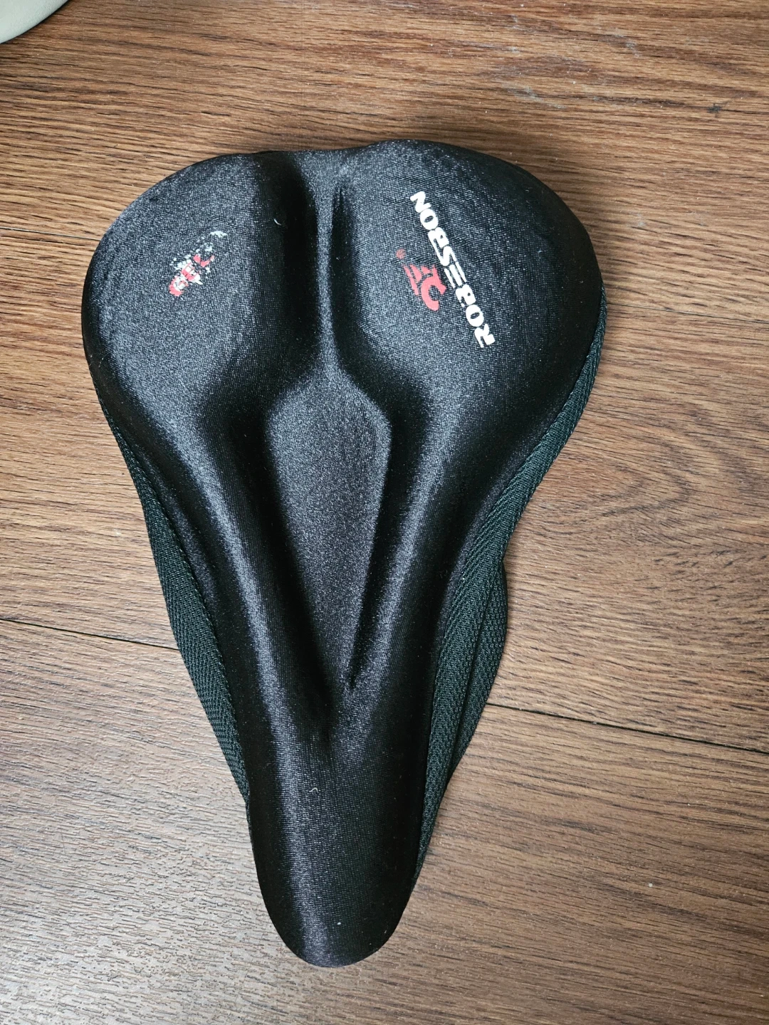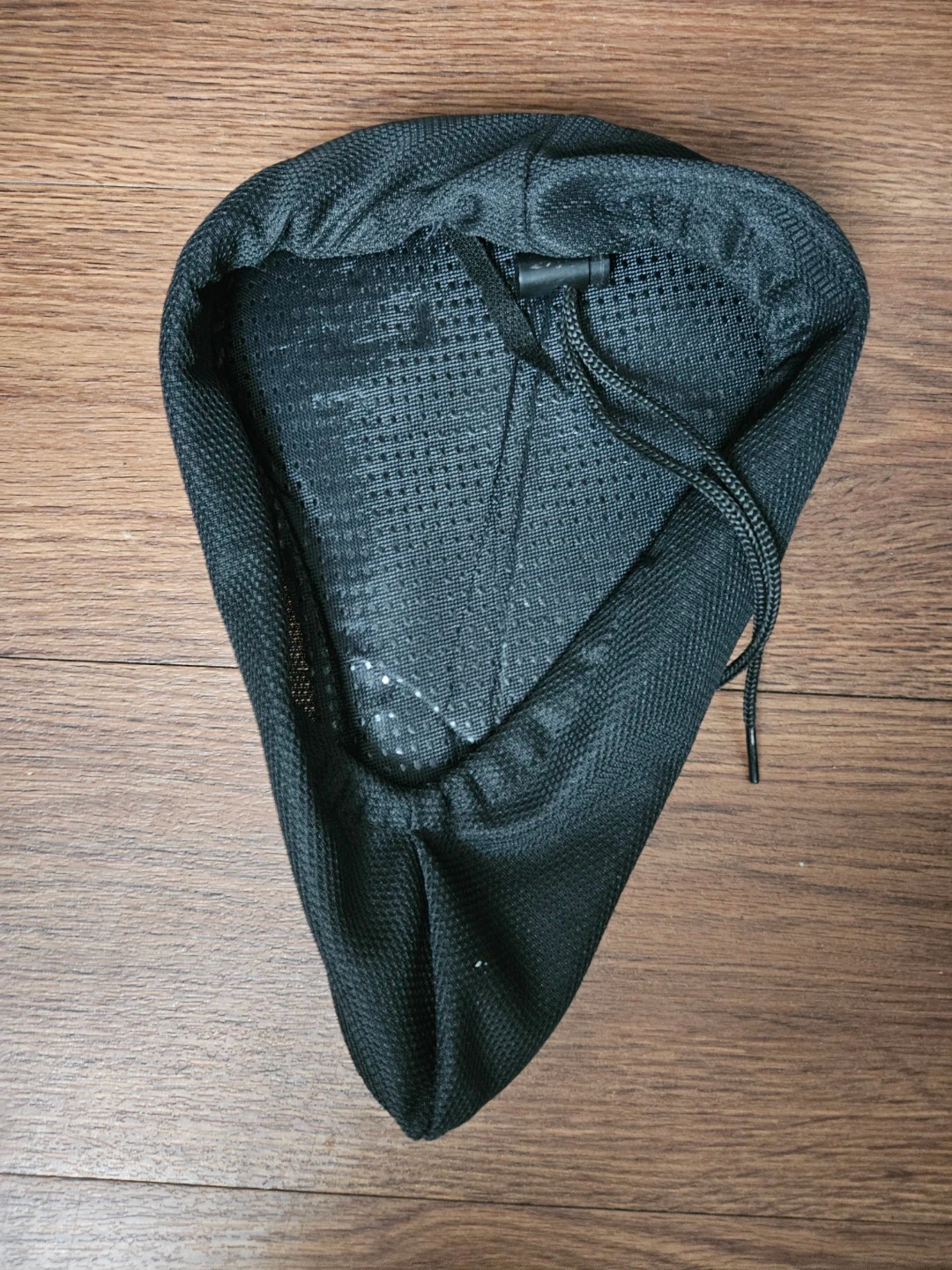 This is a black padded bike seat cover. It's designed for added comfort during rides. The cover includes a drawstring for a secure fit.