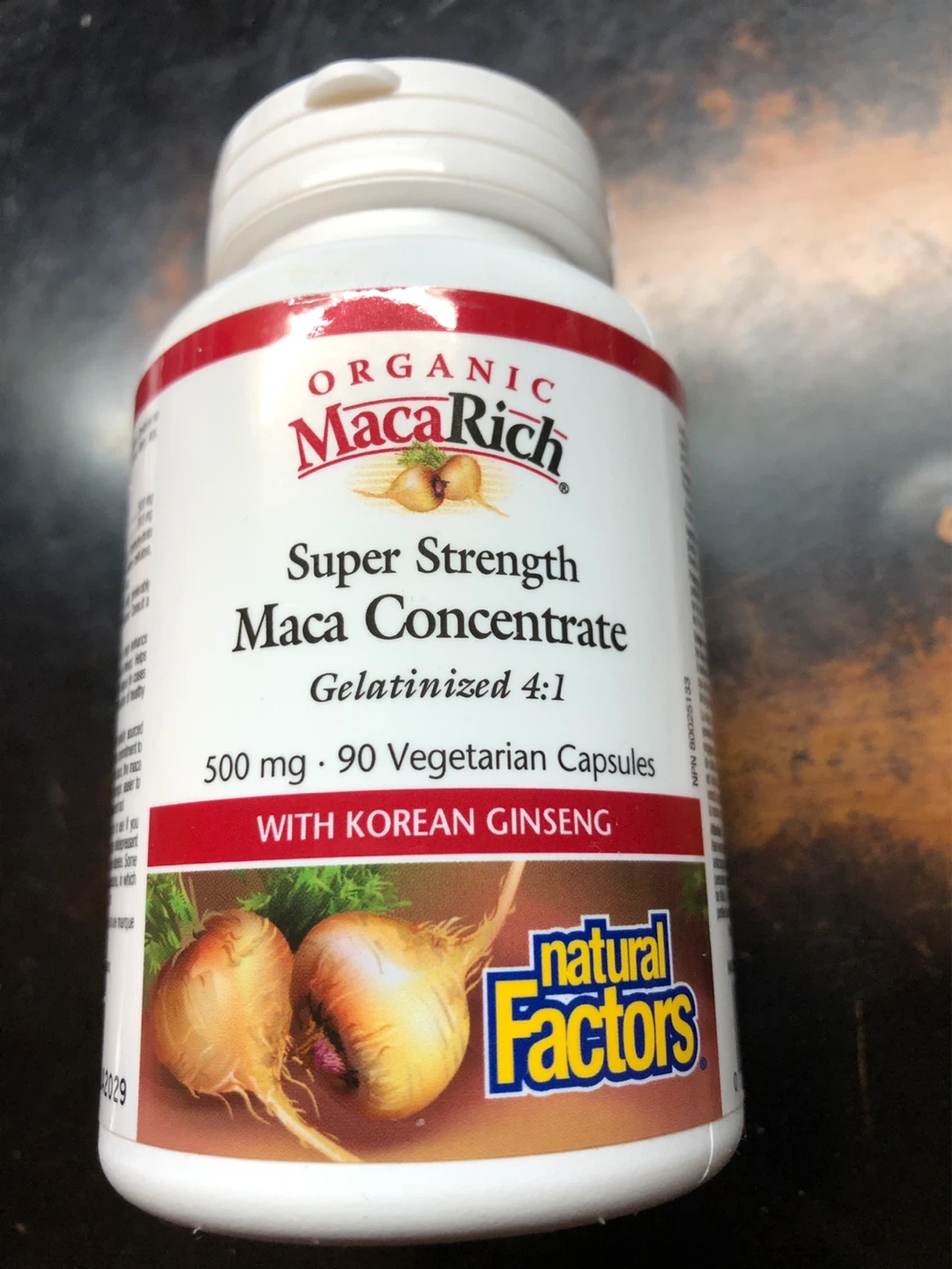 Organic MacaRich Super Strength Maca Concentrate, gelatinized 4:1. Each capsule contains 500 mg of Maca Powder (Lepidium meyenii) and Panax ginseng root. Expiry 2029.