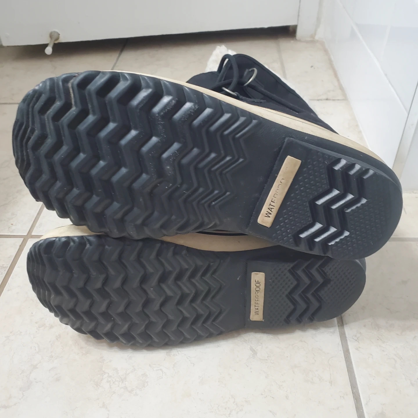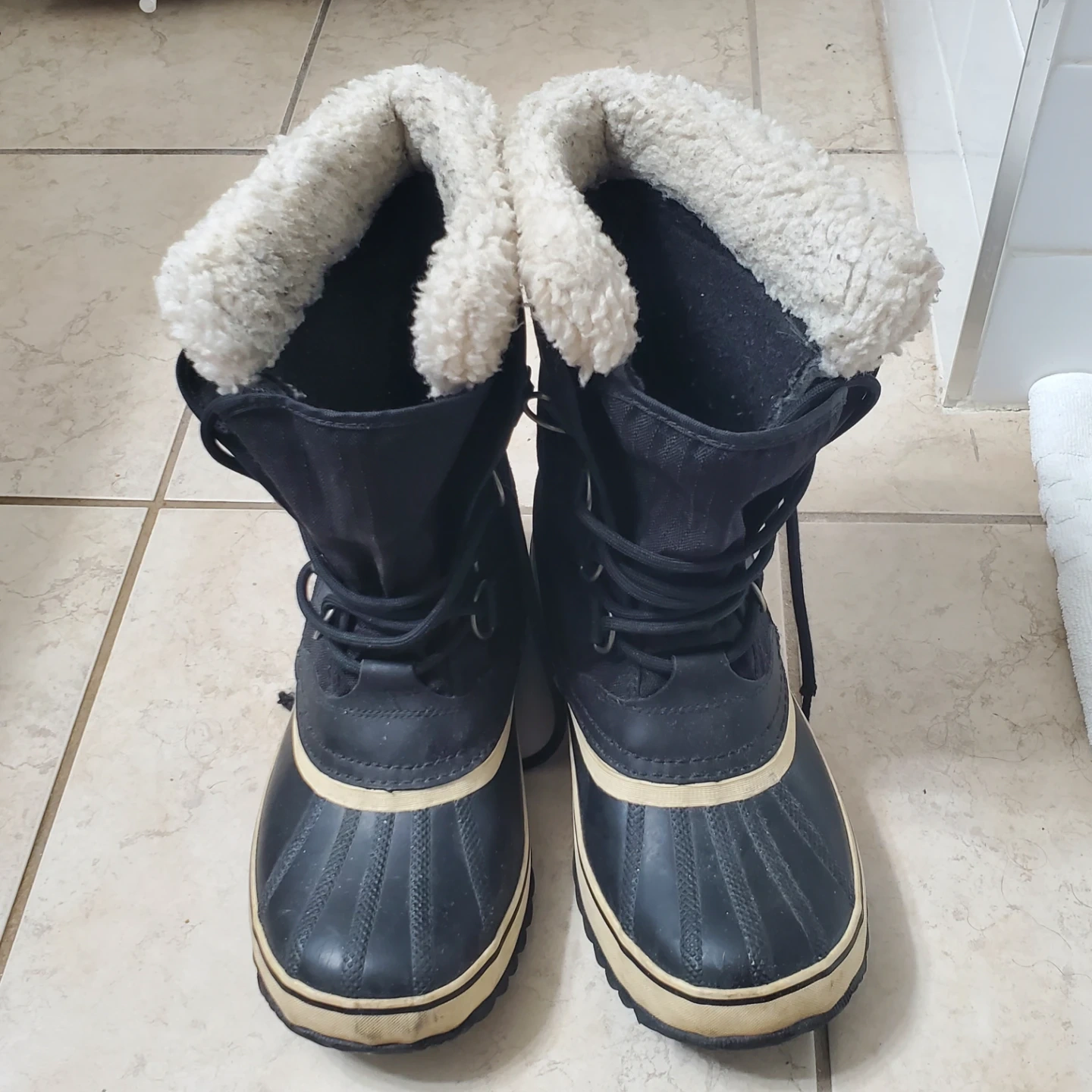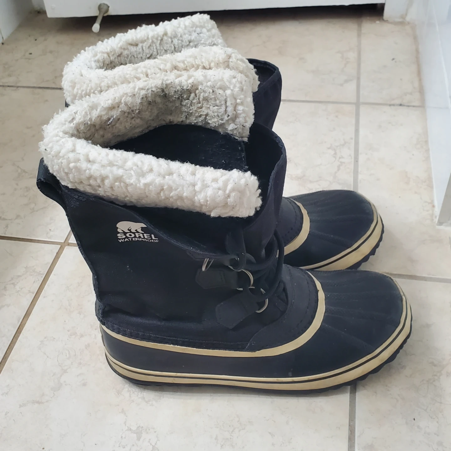 Sorel black winter boots with white sherpa lining and cream sole accent. These boots are waterproof and insulated for cold weather. They feature lace-up closure and a durable rubber base. Perfect for keeping your feet warm and dry on chilly days!