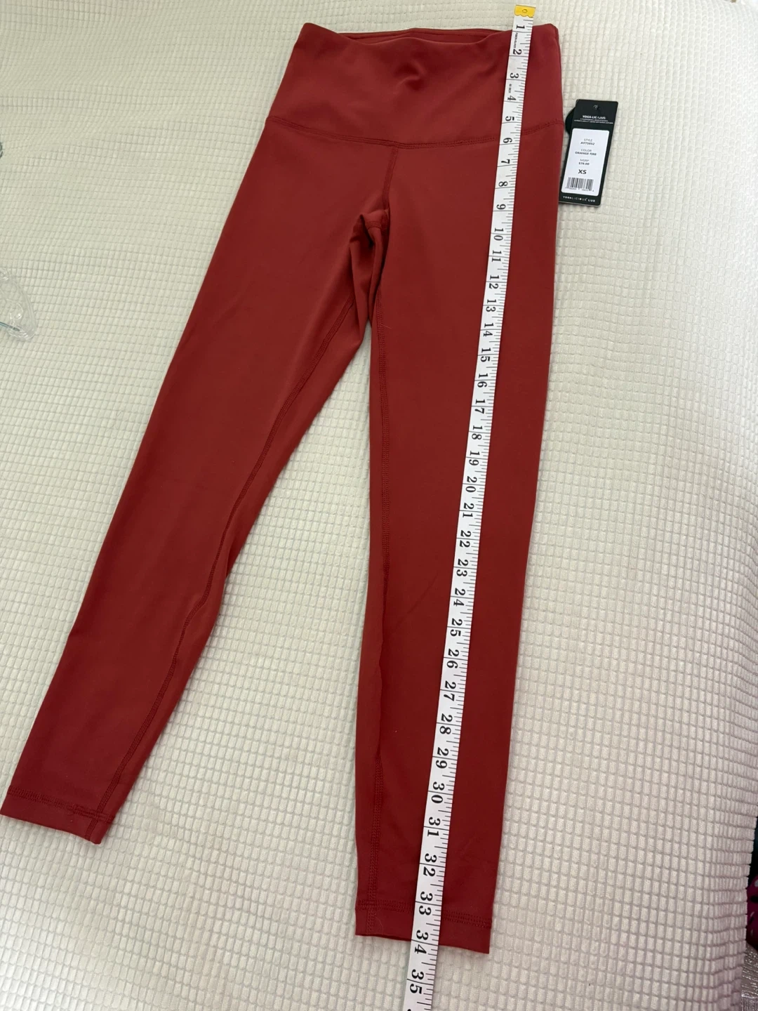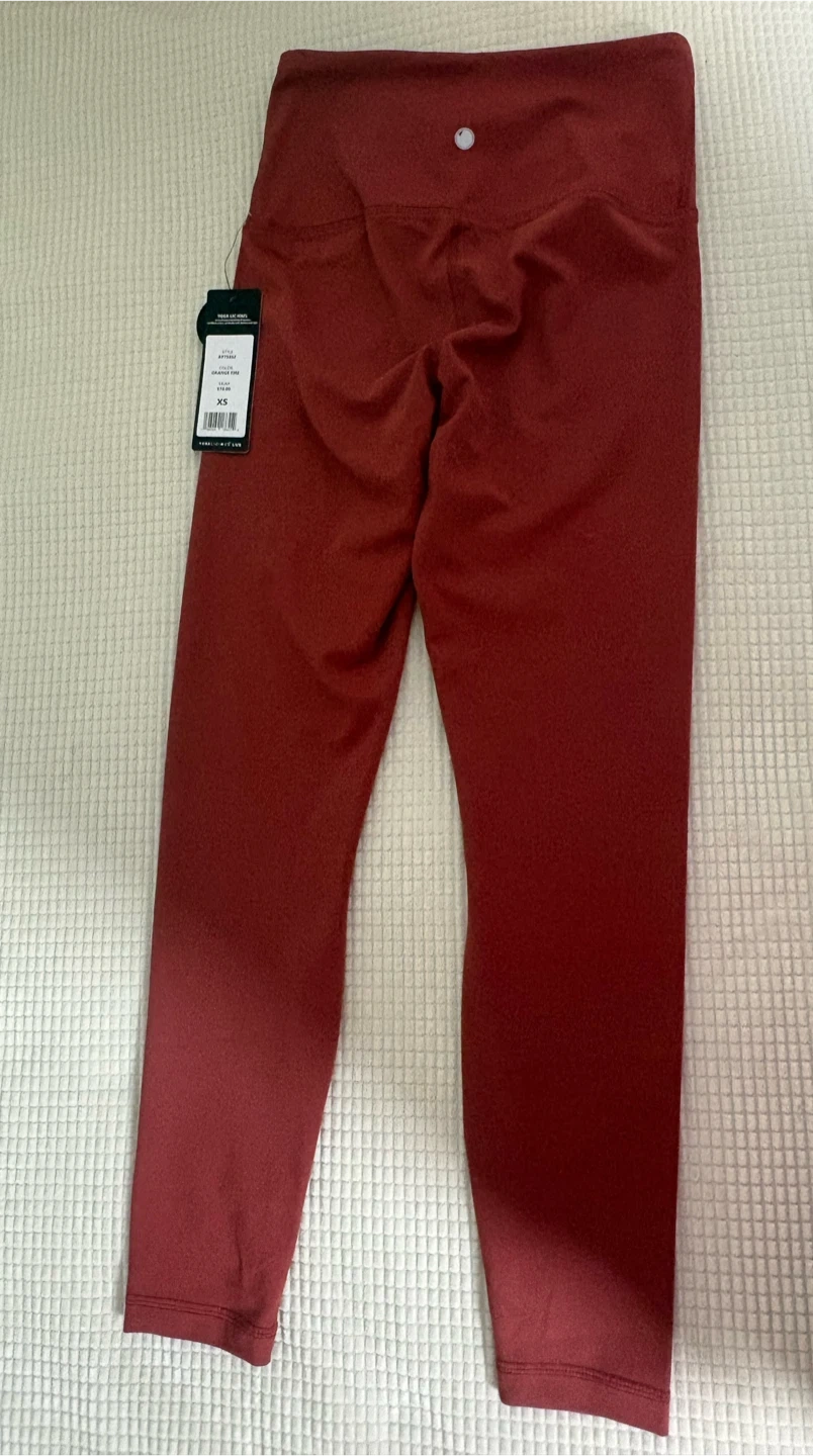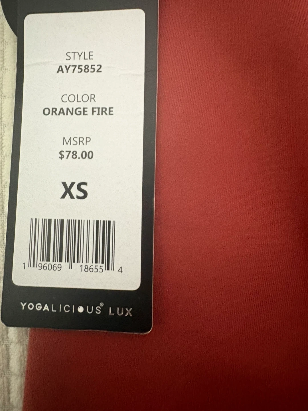 Yogalicious Lux capri leggings in Orange Fire color. Body: 83% polyester, 17% spandex. Contrast: 90% polyester, 10% spandex. Size XS. Made in China. Wash with like colors.