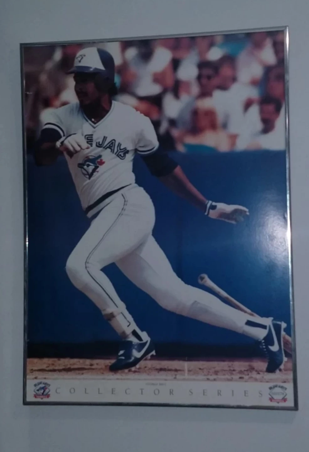 This is a collector series photo featuring a Toronto Blue Jays player, George Bell in action. It showcases the team's iconic blue and white uniform.v George Bell being the first melaninated player to ever play for the Blue Jays A great item for any baseball fan! Only 100 000 made and this number 357 of 100 000.