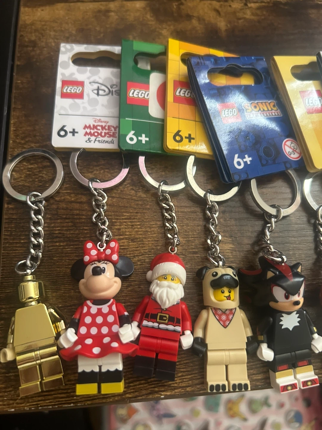 A collection of LEGO keychains featuring characters like Mickey Mouse & Friends, Sonic the Hedgehog, Grogu from Star Wars, and Ghost-Spider from Marvel. Each keychain is brand new and comes in its original packaging. Perfect for fans of these franchises!