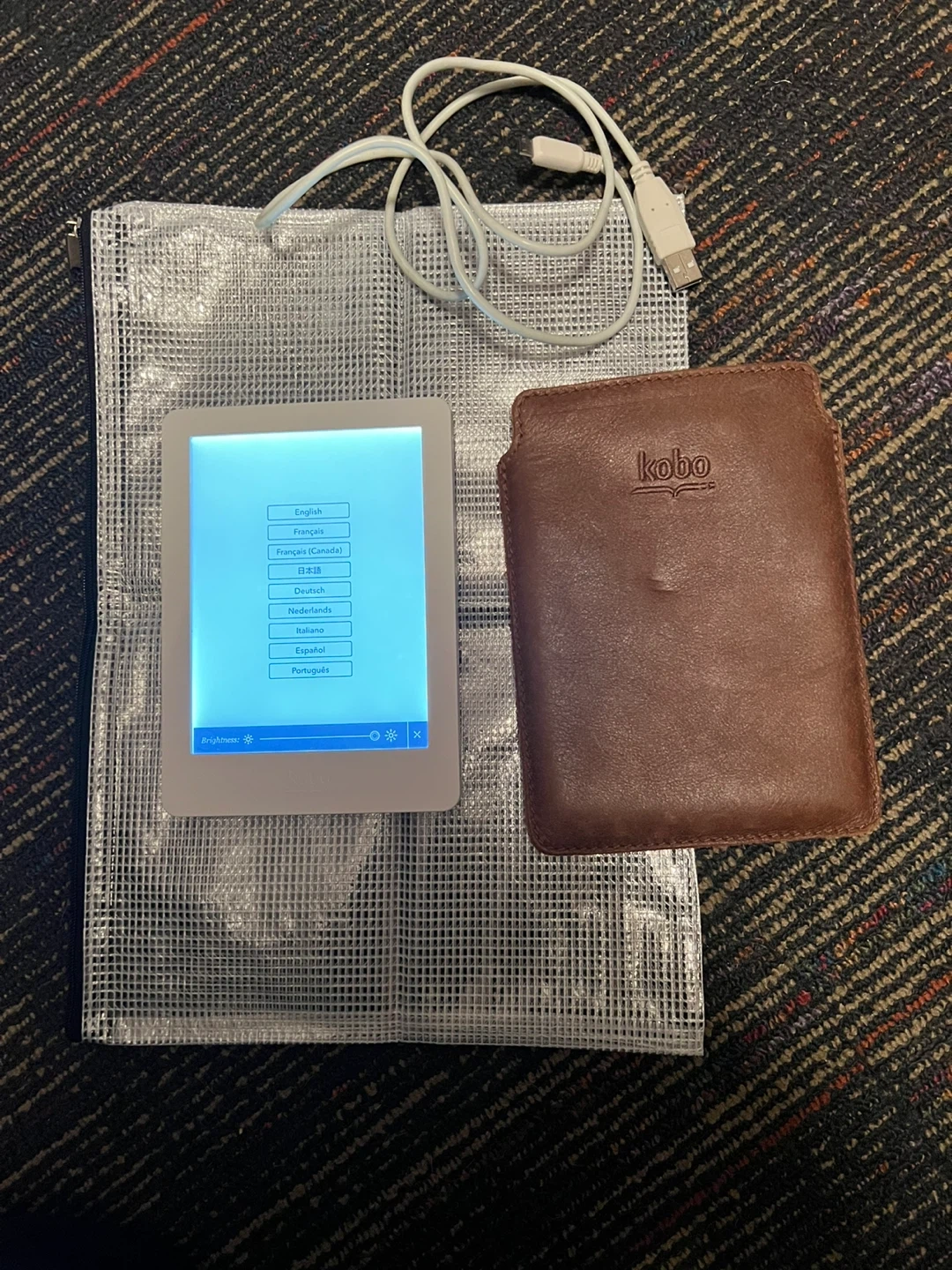 Kobo e-reader is white with a brown leather case. It comes with a clear protective sleeve and a USB charging cable. Multiple language options are available on screen.