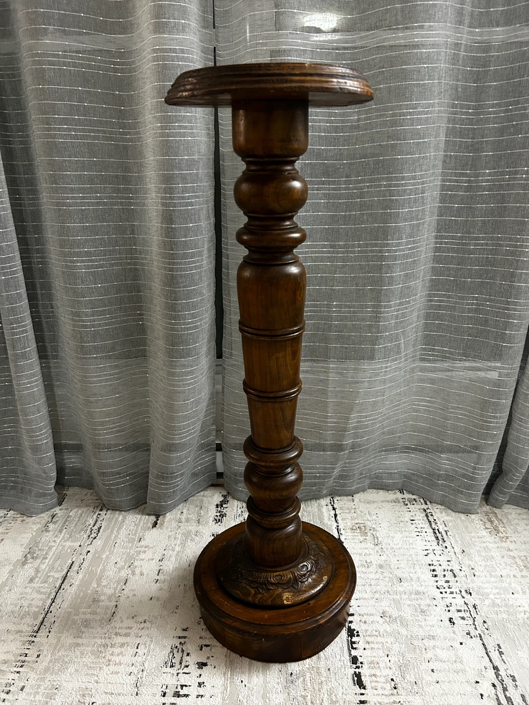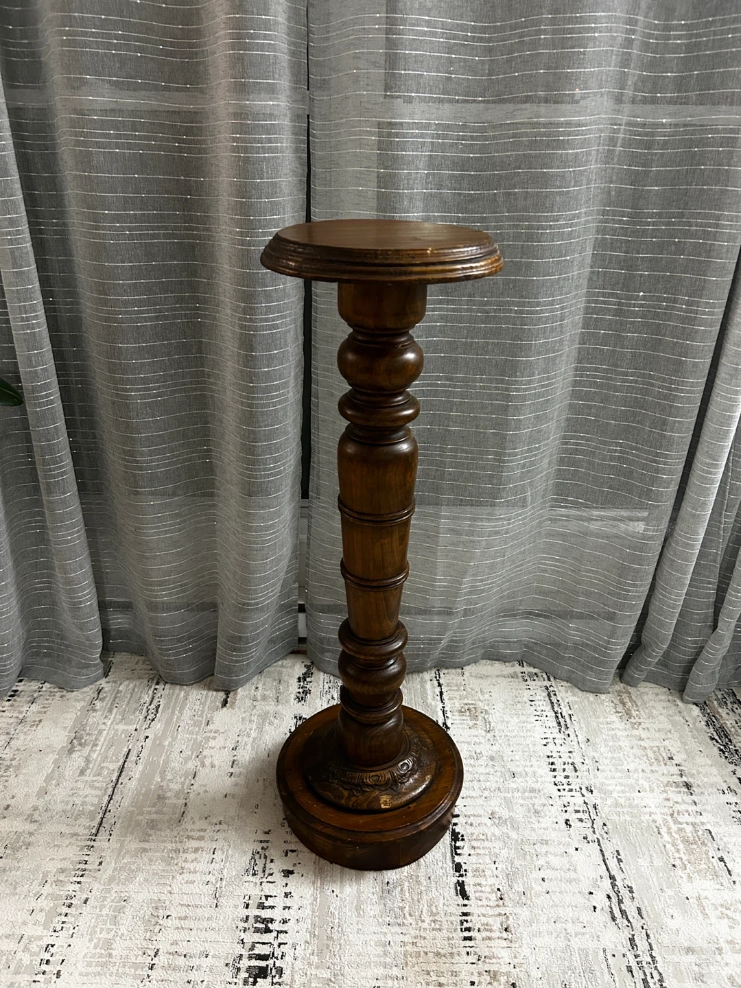 This is a beautiful vintage wooden pedestal stand with ornate detailing. It's ideal for displaying plants or decorative items. Its sturdy construction makes it a lasting addition to your home decor.
