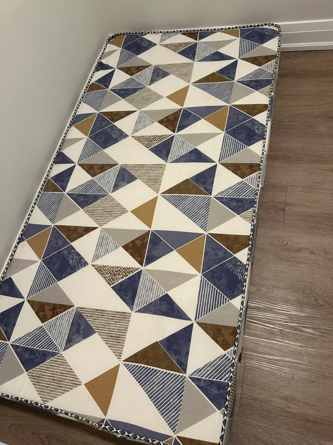 Moving out sale Only 1 time use we buy $150 its good quality This is a toddler mattress featuring a modern geometric pattern in blue, brown, and grey. It's designed for cribs or toddler beds. The cover is made of a durable, wipeable fabric. With wraping plastic moving out sale