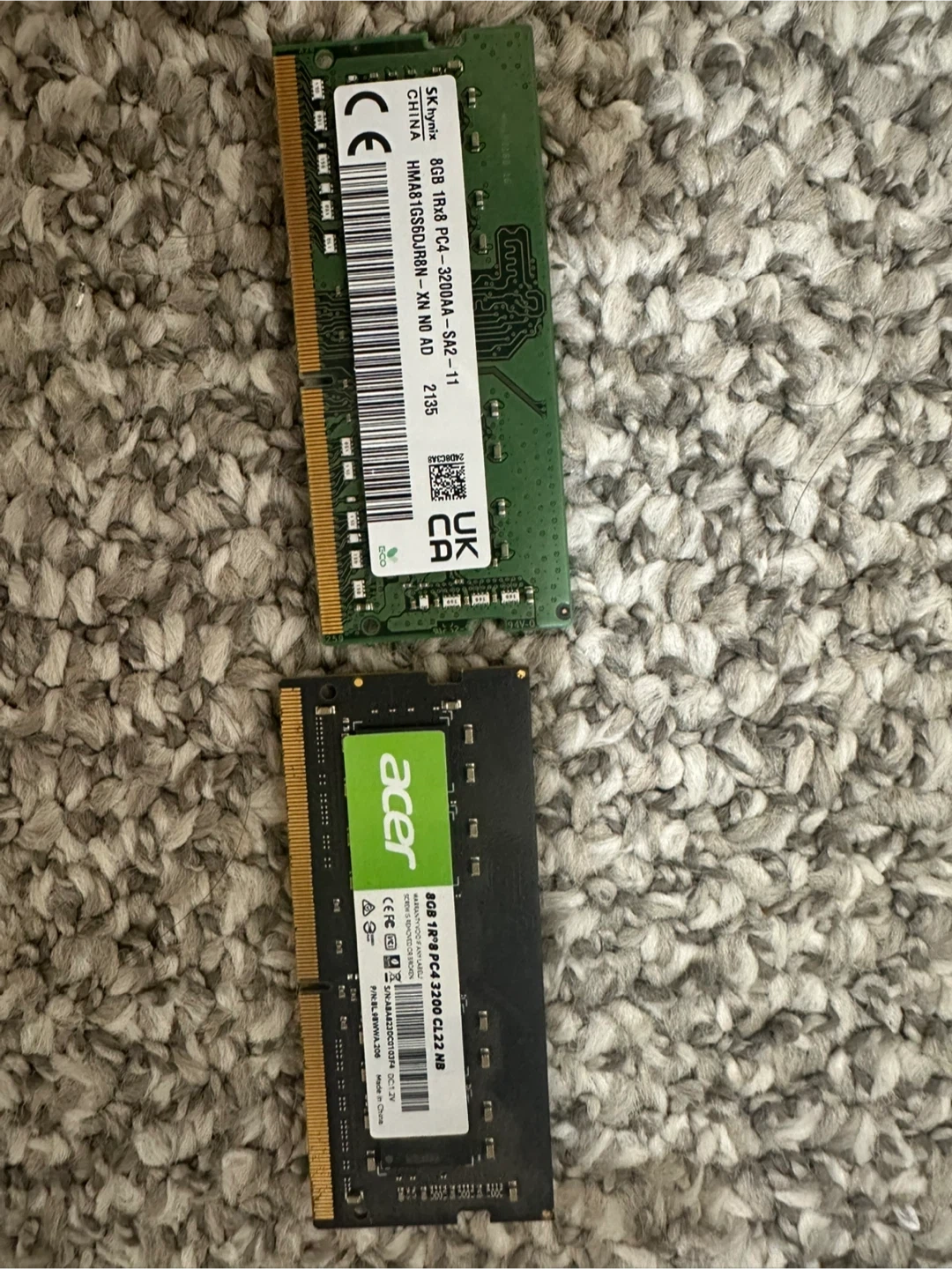 Selling two 8GB DDR4 laptop RAM modules. One is SK Hynix, and the other is Acer branded. Both are 3200mhz and I’ve had no issues installing both of them on my laptop They're perfect for upgrading your laptop's memory!