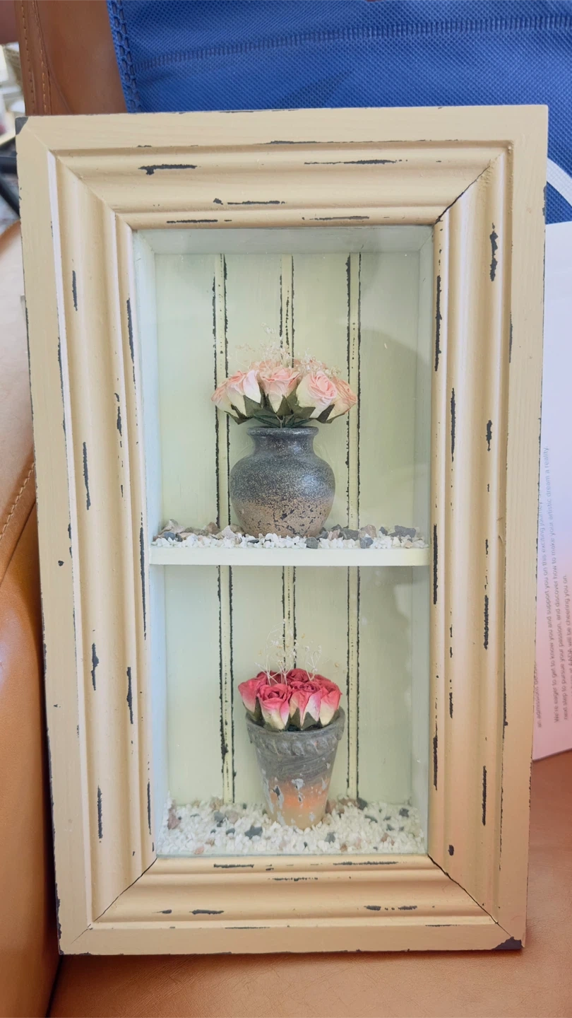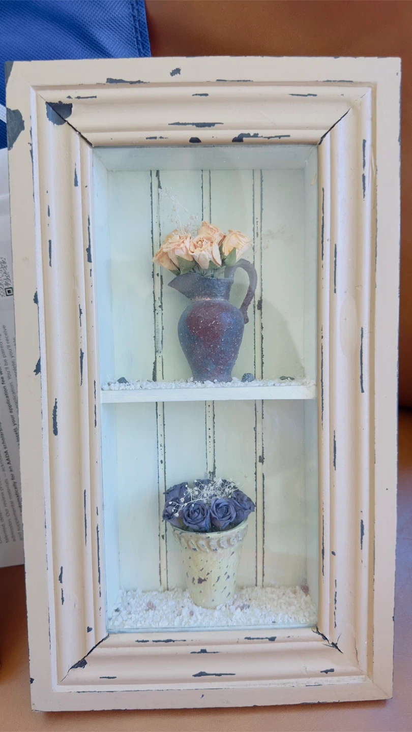 This charming shadow box features two shelves displaying faux floral arrangements in decorative vases. It's a lovely piece for home decor. Some distress on the frame adds a rustic touch.