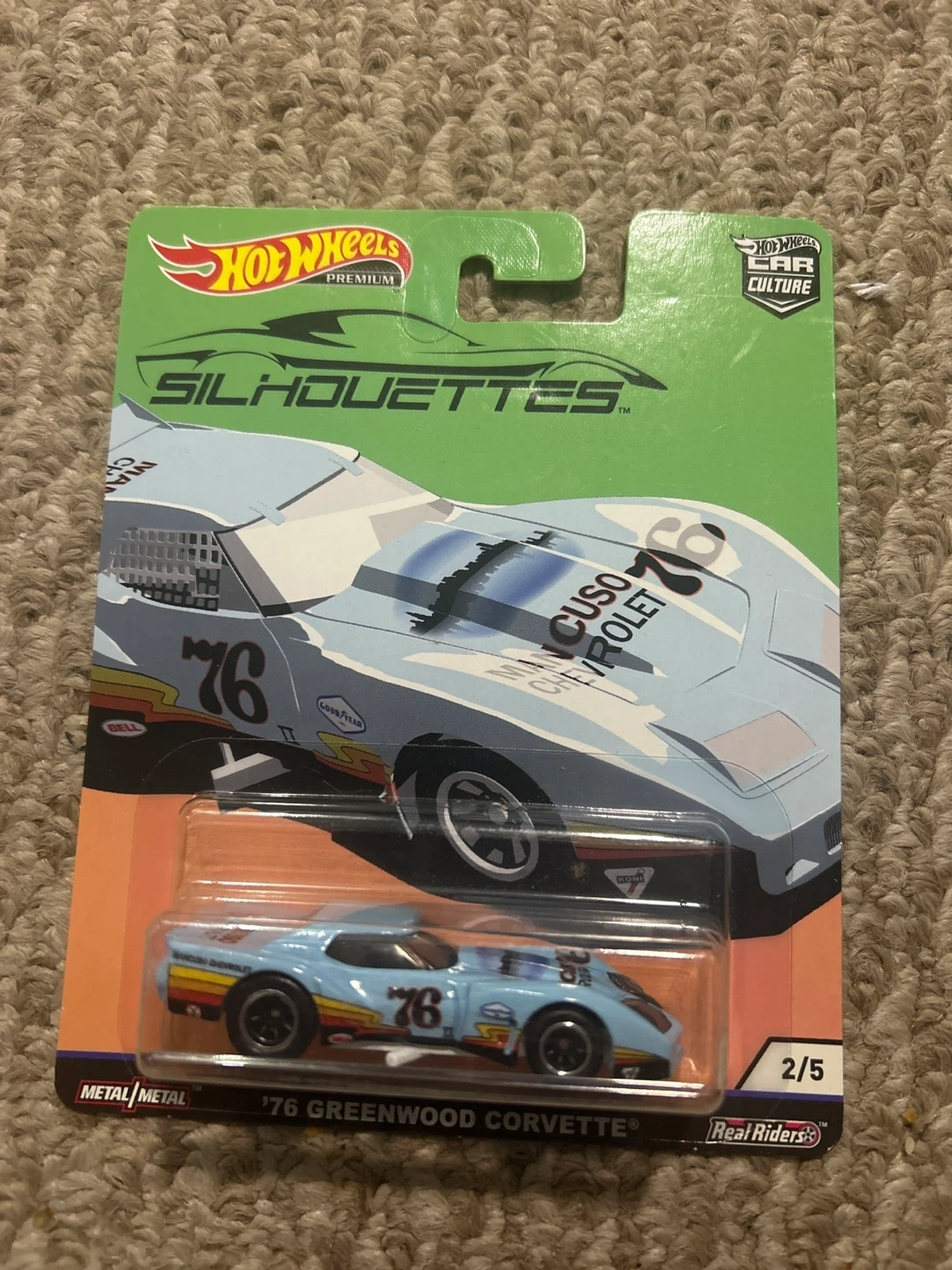 This is a Hot Wheels Premium diecast car, featuring the '76 Greenwood Corvette. It's part of the Silhouettes Collection. Metal body and Real Riders wheels.