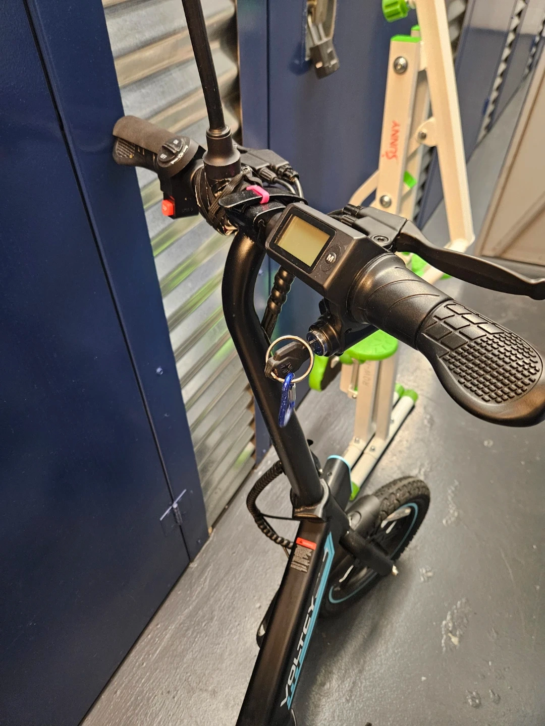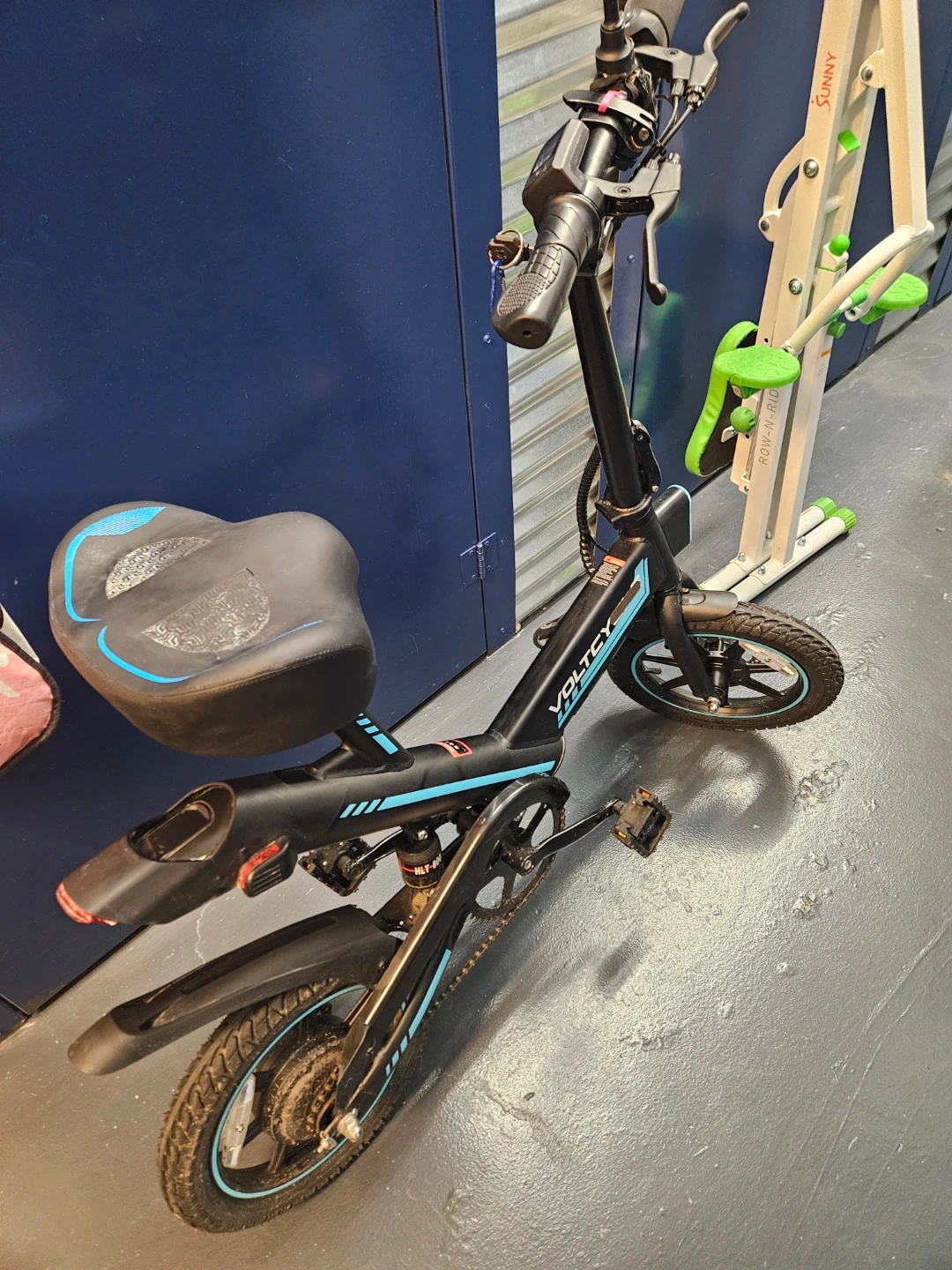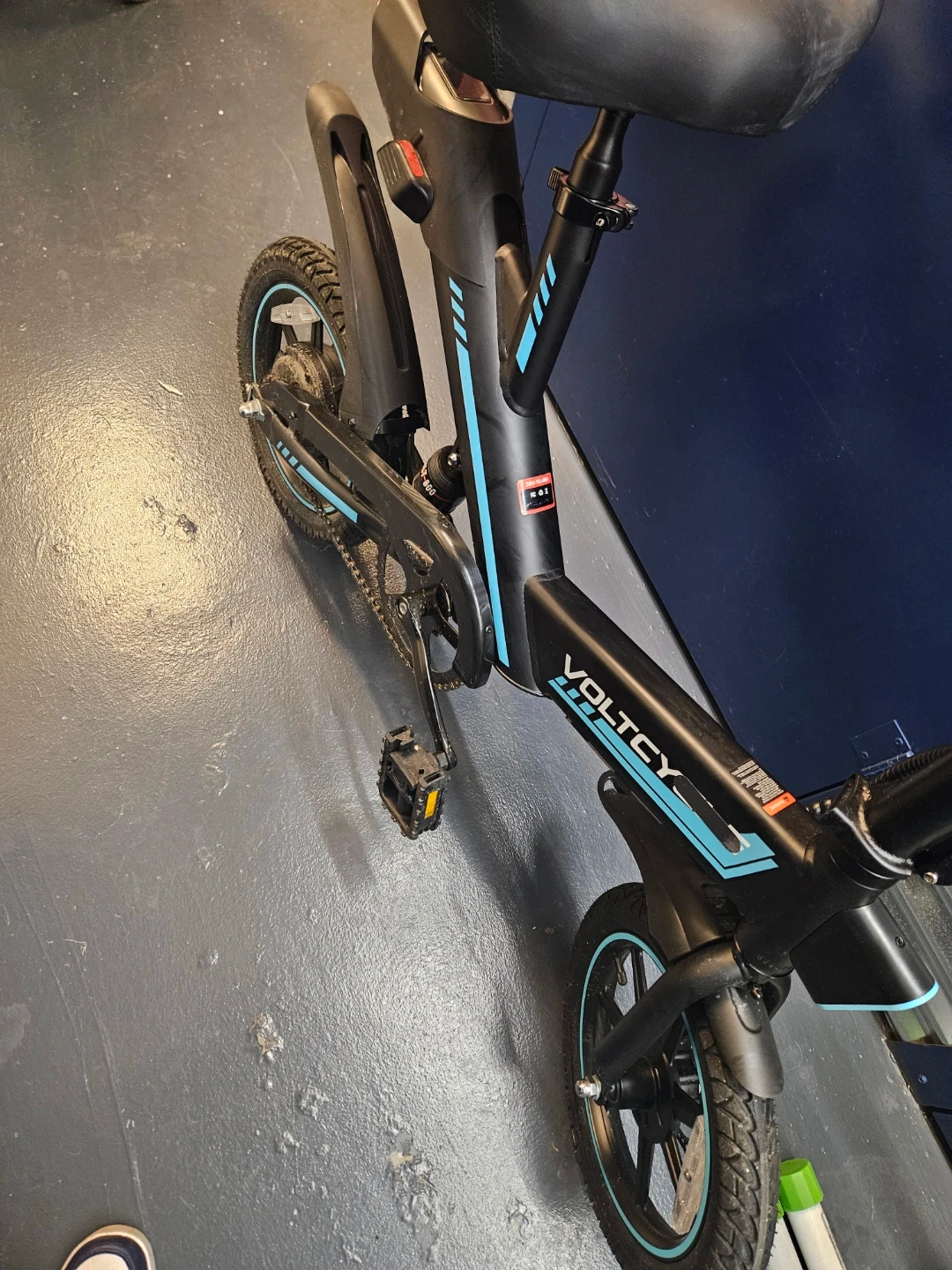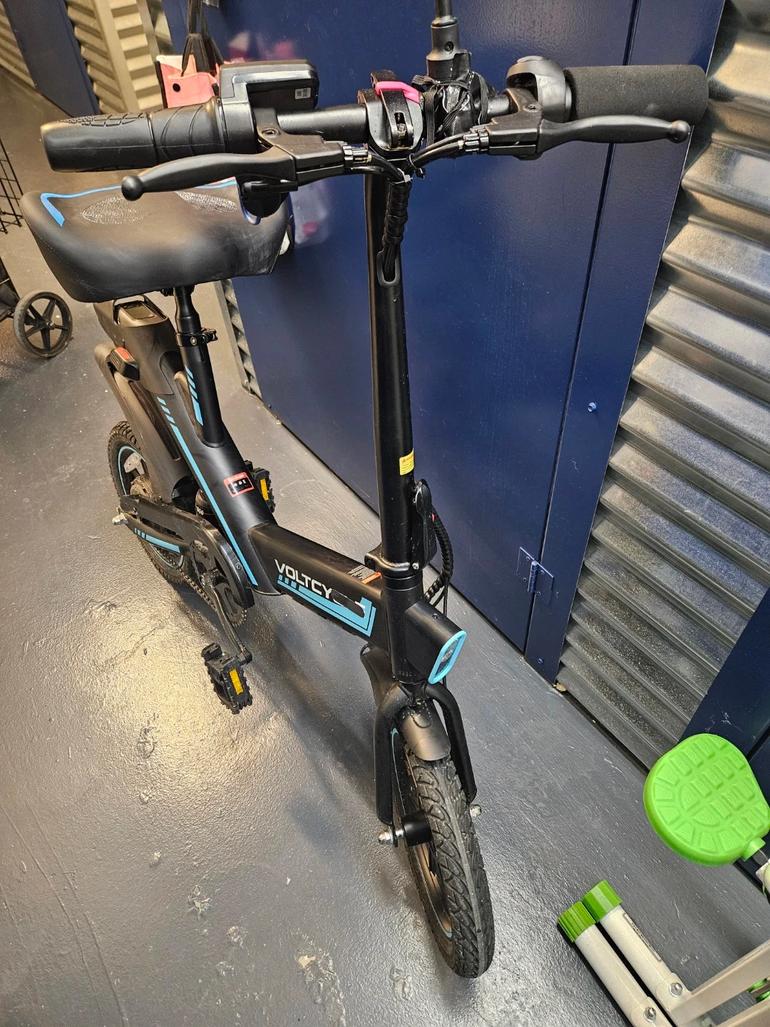 This is a black VOLTCY electric scooter with a comfortable seat. It's designed for urban commuting. Features include a digital display and adjustable handlebars. Great for getting around town quickly!