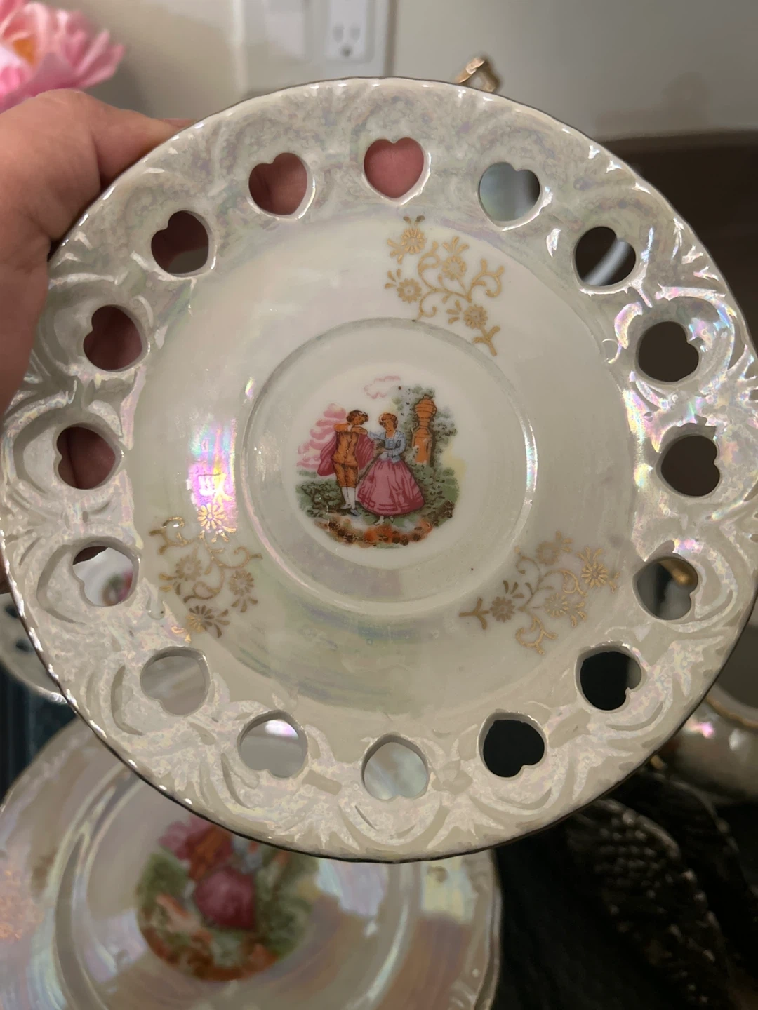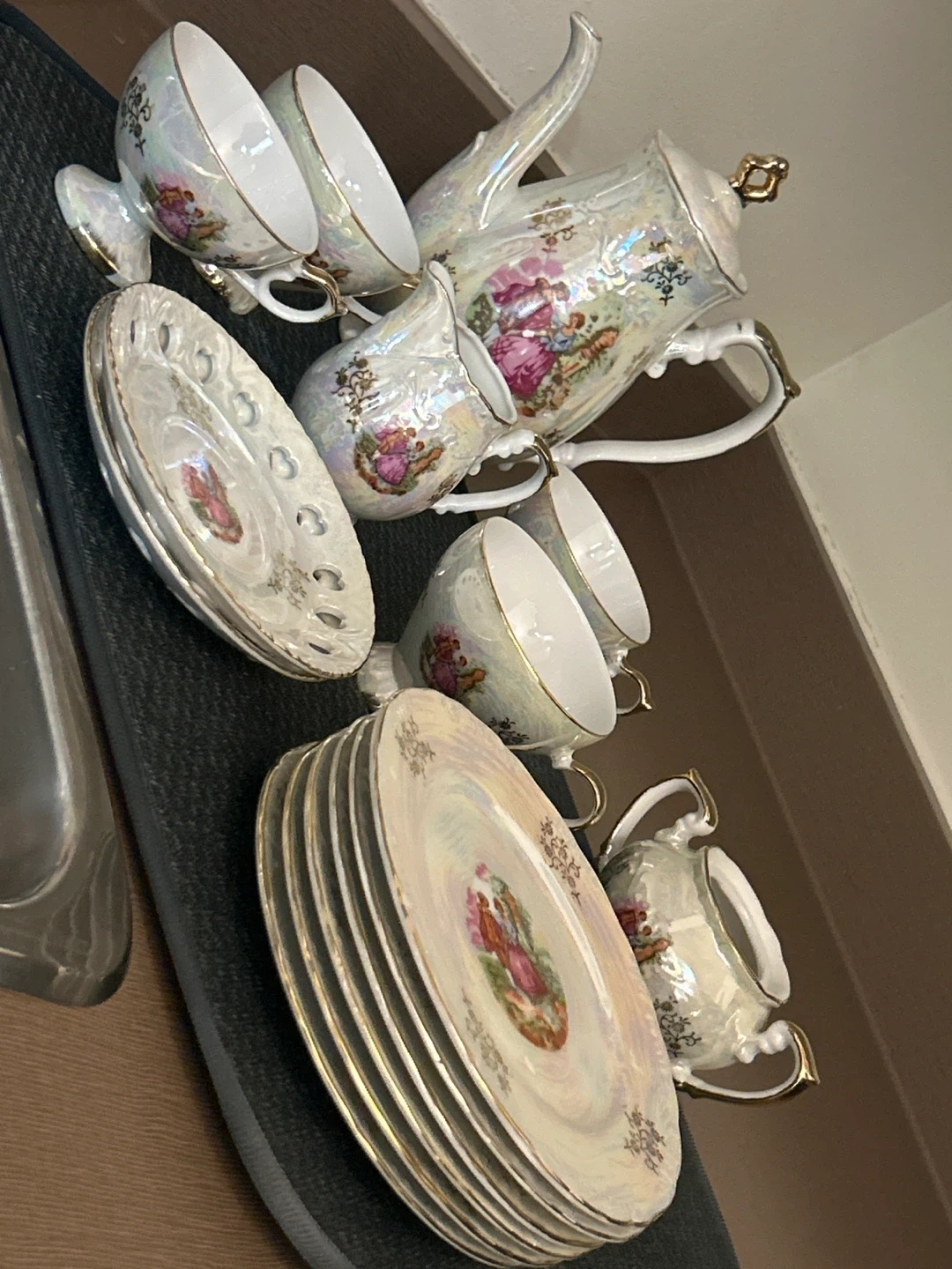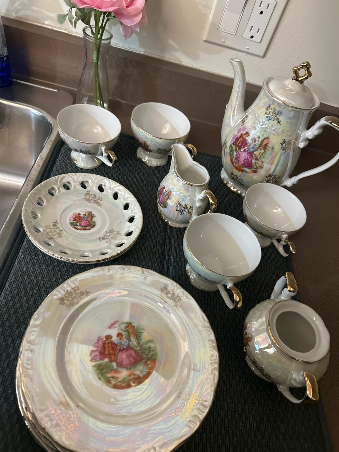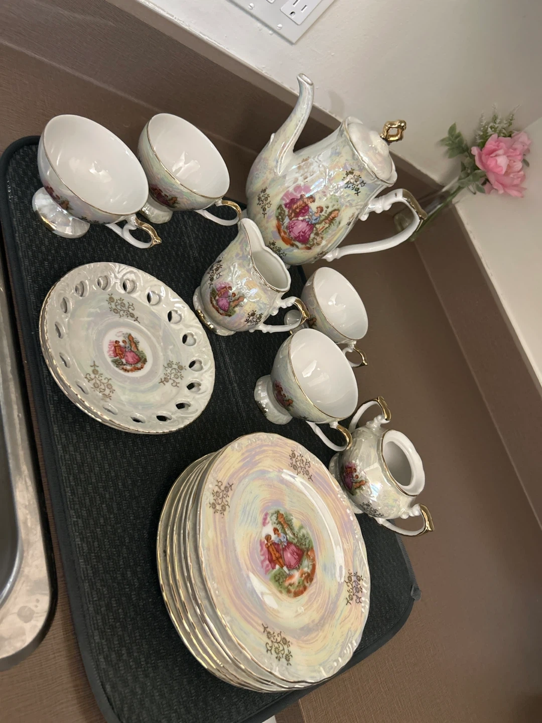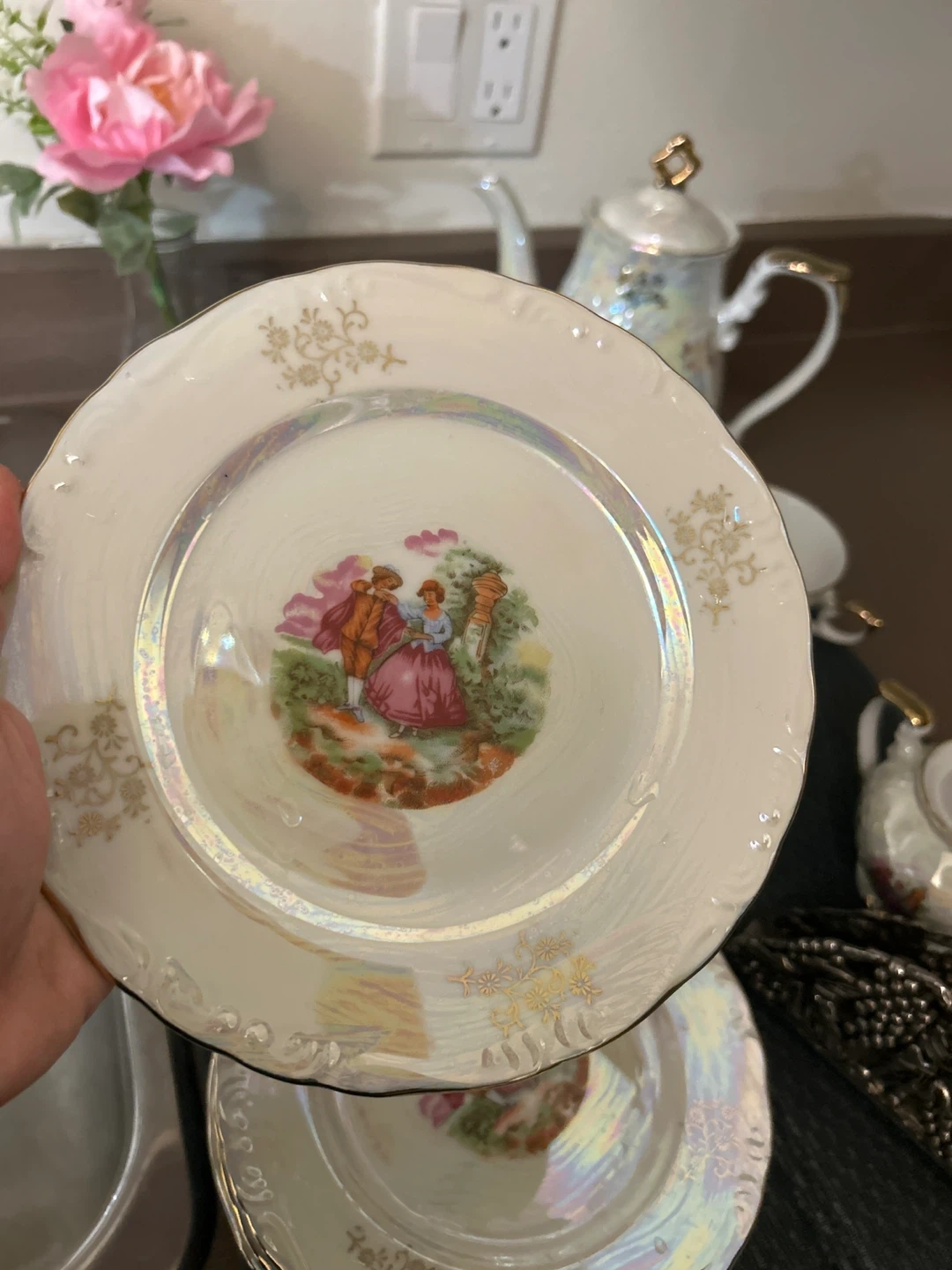✨This stunning Vintage Lusterware Tea Set features an iridescent pearlescent finish and a romantic "Fragonard" courting couple motif, a design popularized by Japanese and German makers like Eiho and Kahla. The set is accented with elegant gold-leaf trim on the handles, rims, and spouts. Multi-piece collection including a teapot, creamer, sugar bowl, four matching cups with saucers, and six plates.This set is perfect for a collectors collection, a themed tea party, or as an exquisite display piece in a china cabinet.