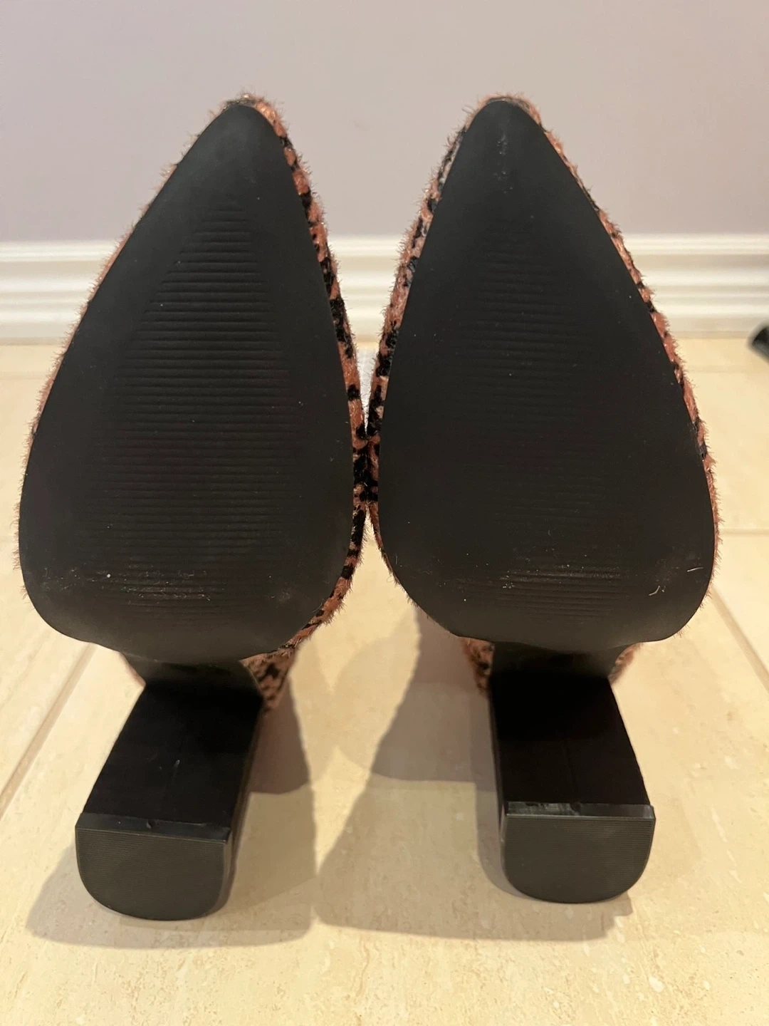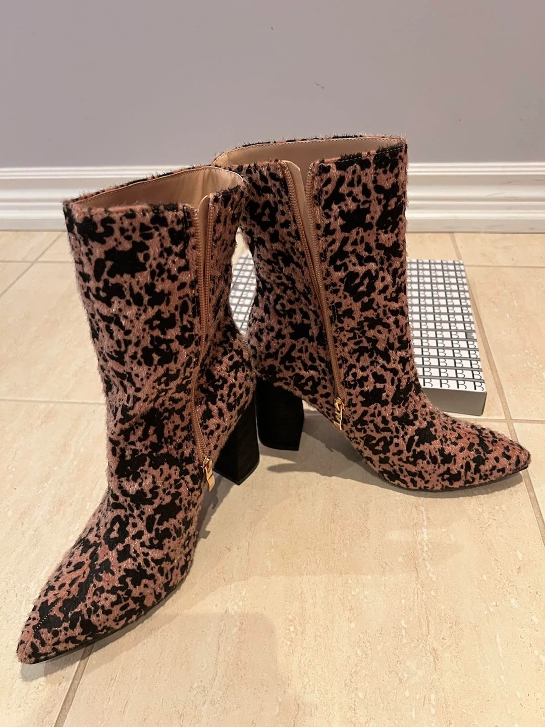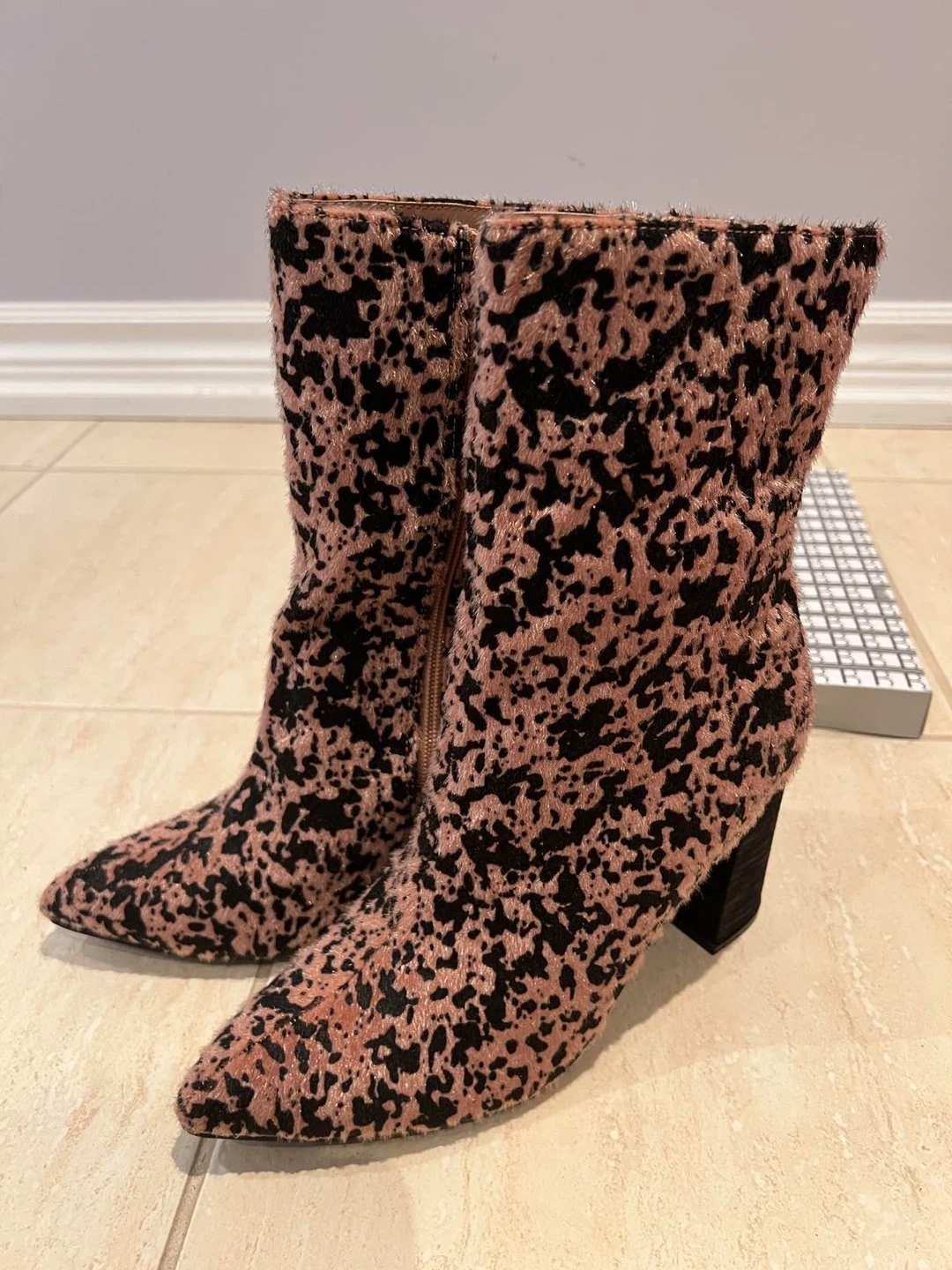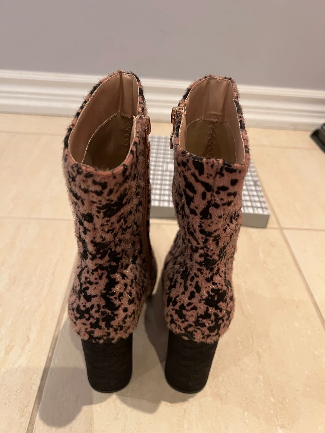 Cute pink and black leopard print ankle boots. These boots have a furry texture and a stylish block heel. They're complete with a side zipper for easy on and off. Add a pop of fun to any outfit!