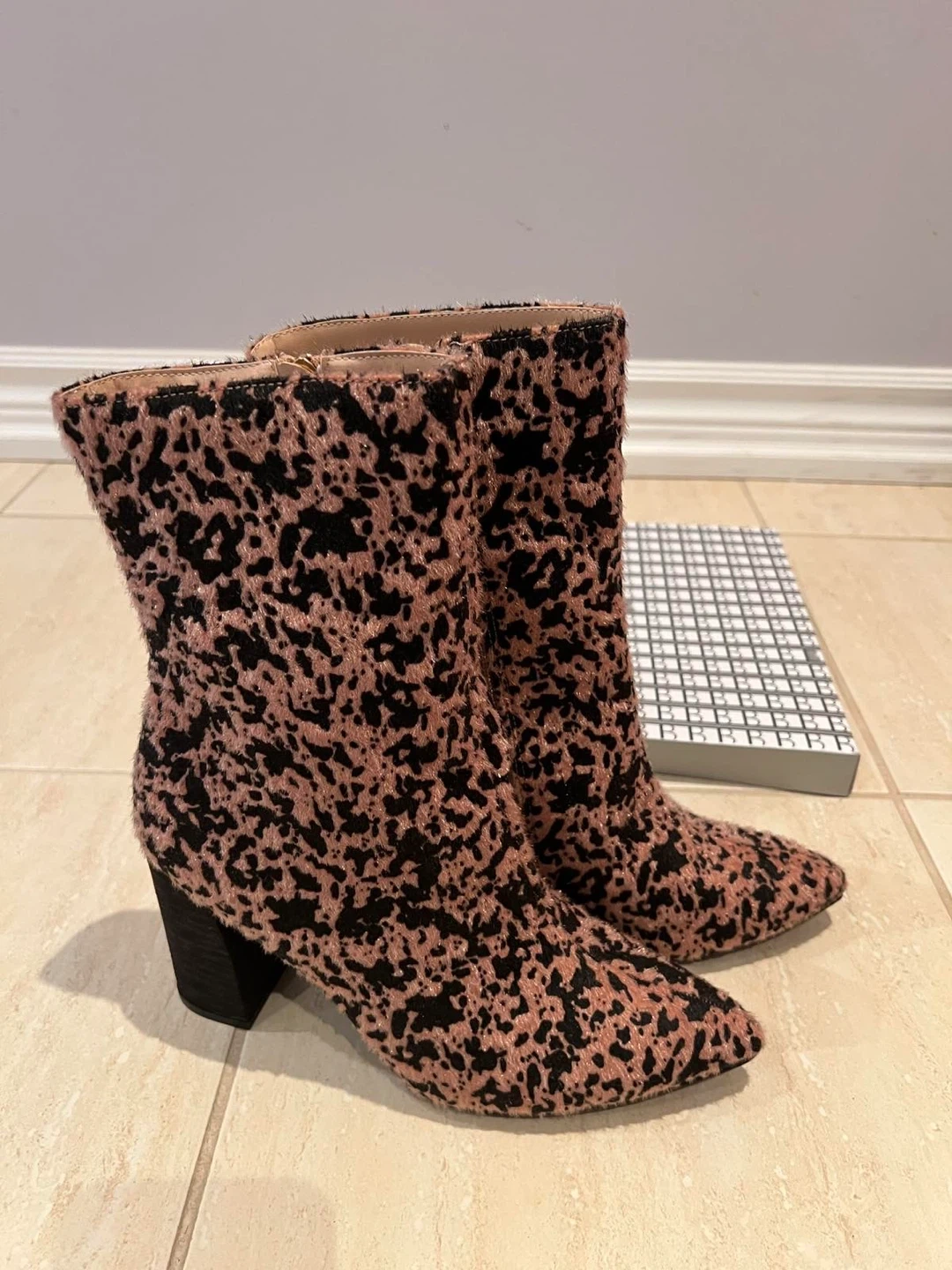 Pink and Black Leopard Print Furry Ankle Boots with Block Heel