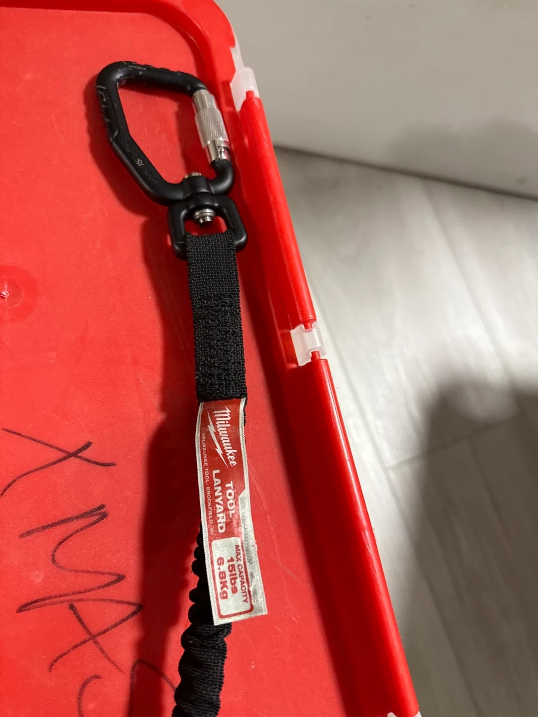This is a Milwaukee tool lanyard with a carabiner. It has a max capacity of 15 lbs or 6.8 kgs. It's great for securing tools when working at heights.