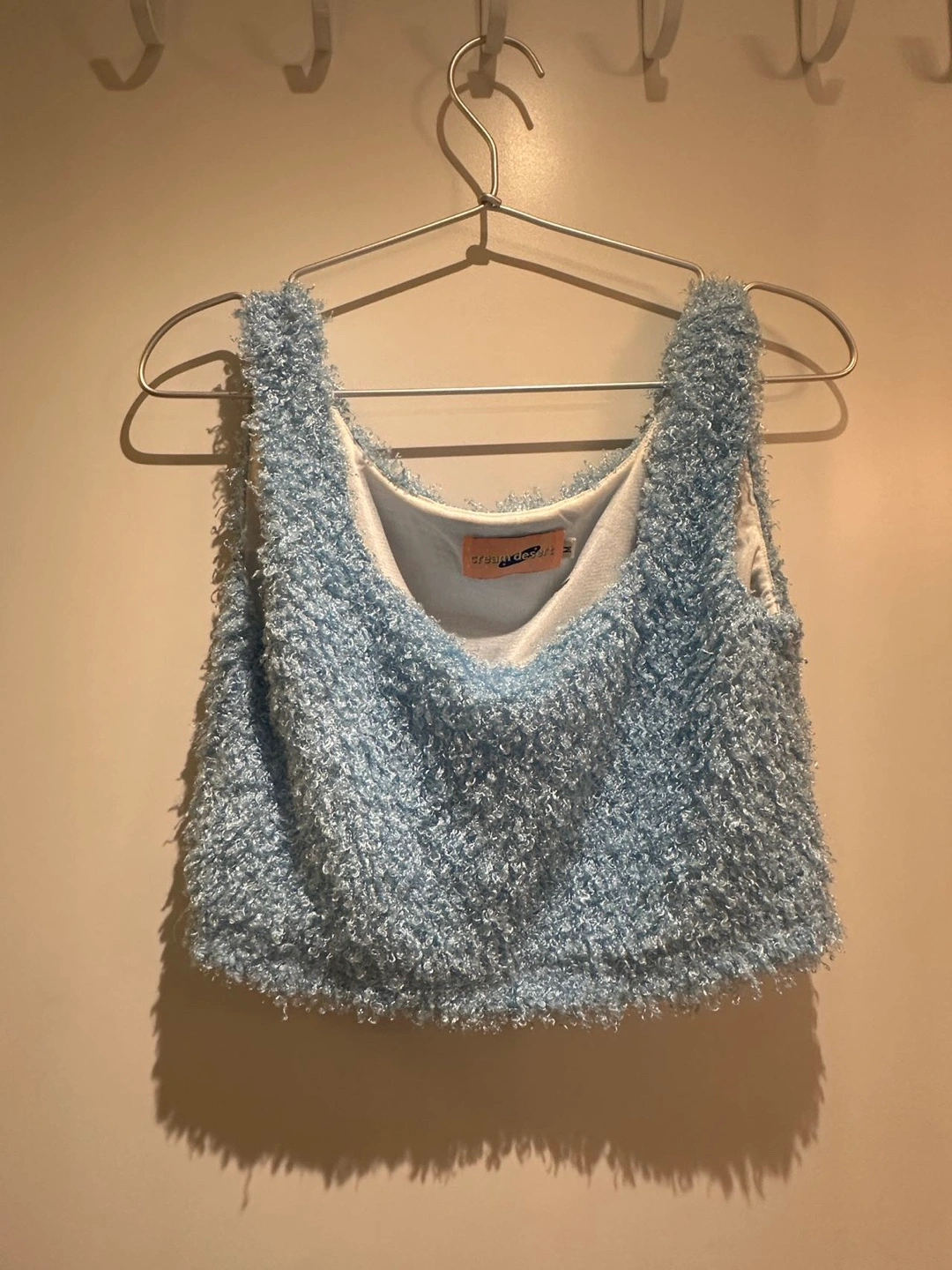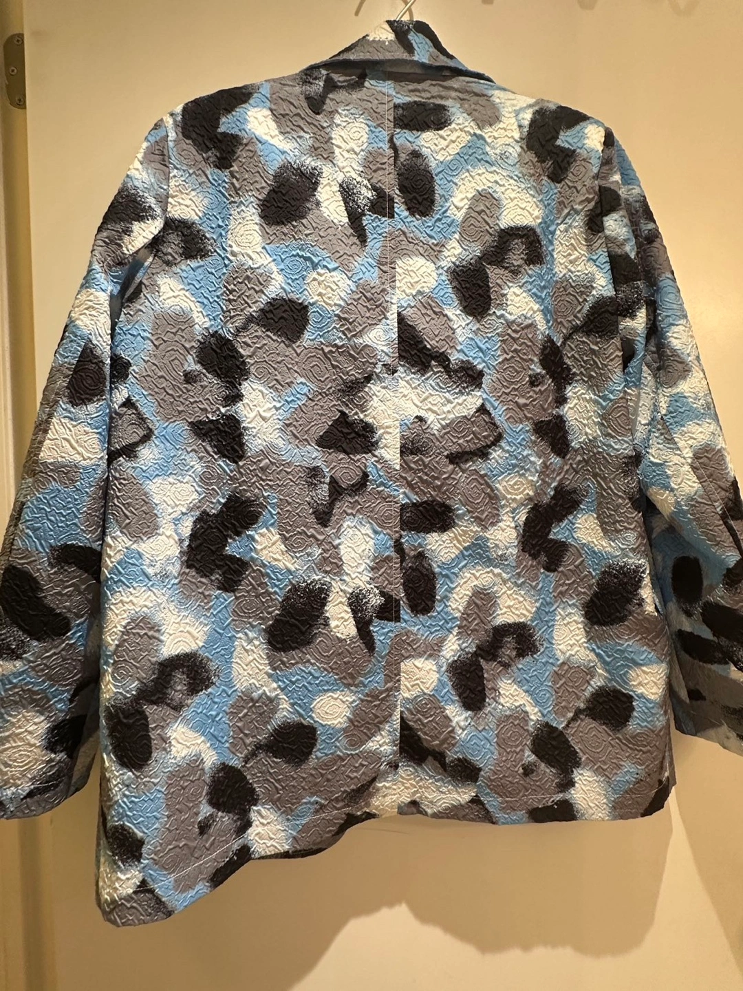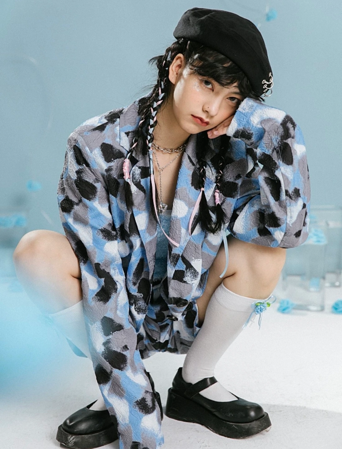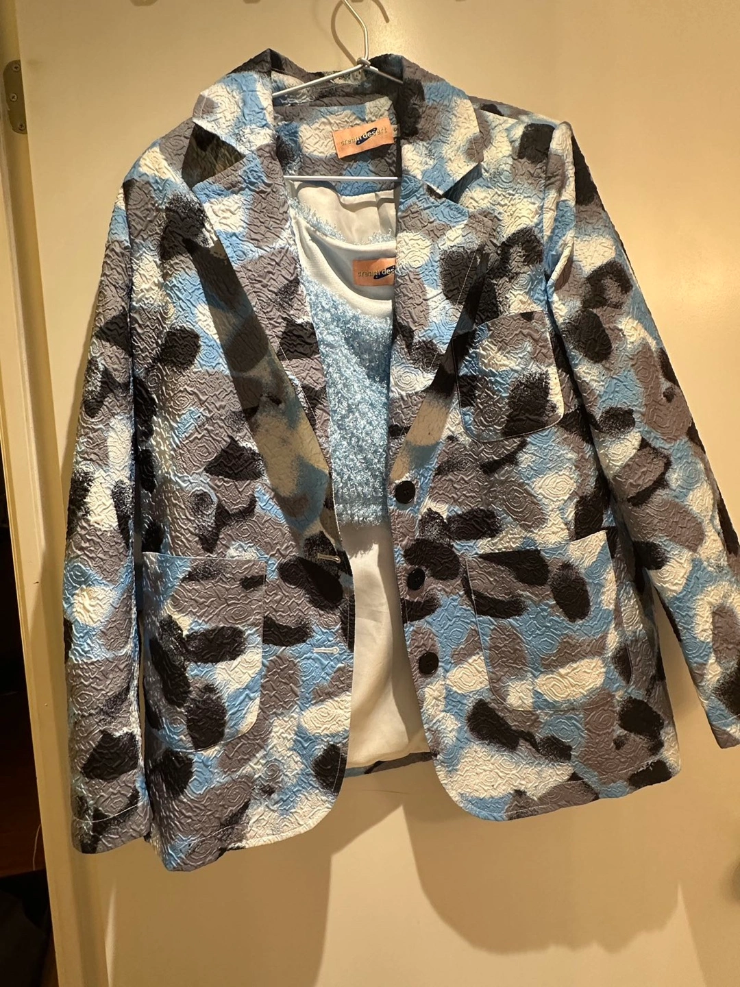 Features a cropped fuzzy light blue top and a blazer with a unique blue, grey, and white abstract print. Stylish and eye-catching.