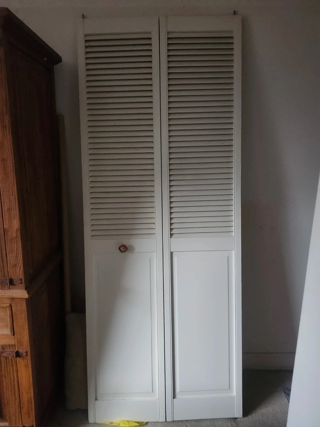 Set of white bi-fold closet doors with louvered panels. These doors have a decorative knob on one door. They're designed to save space when opened. Great for closets or as room dividers!