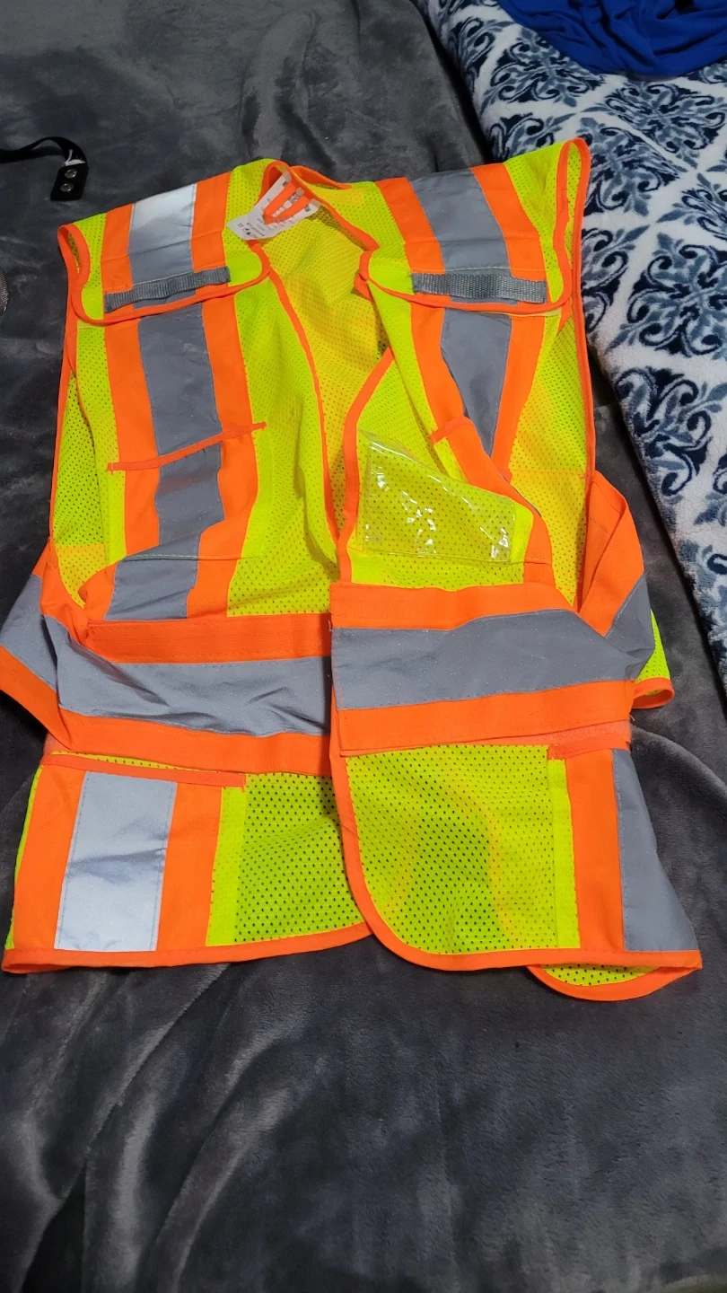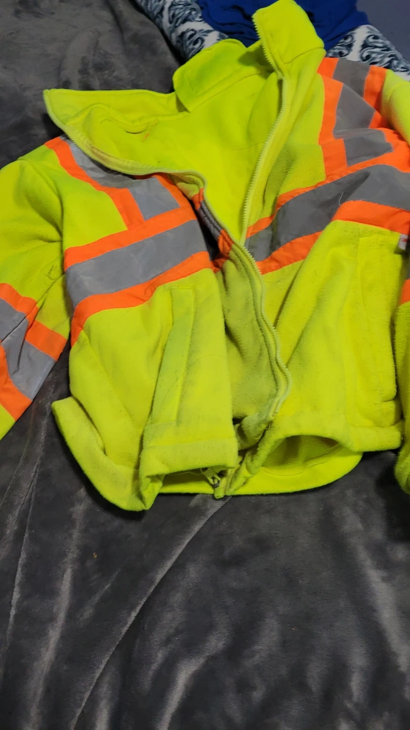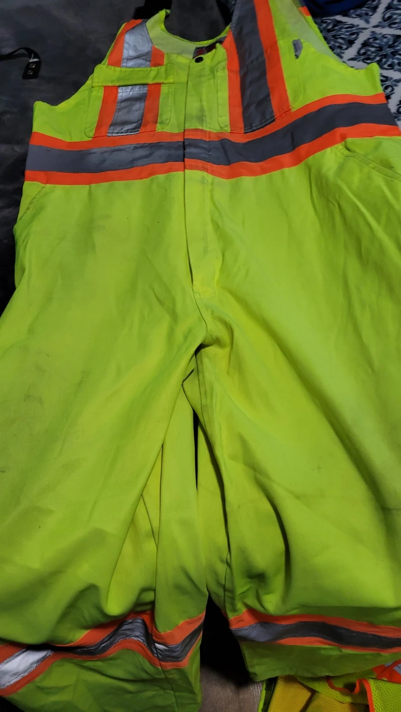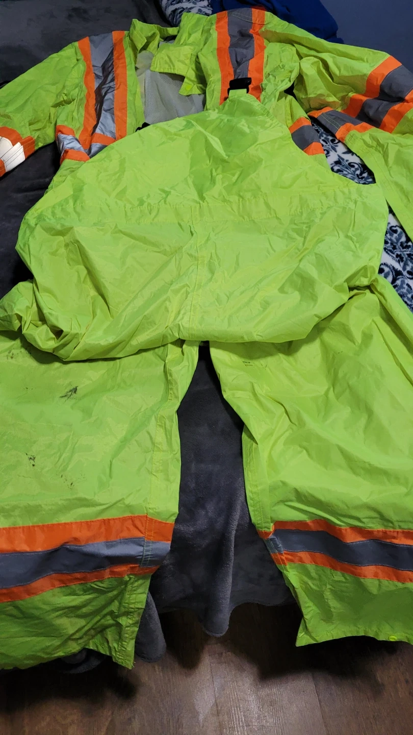 This bundle includes high-visibility work bibs, a safety vest with pockets, and a fleece-lined jacket. All pieces are designed for safety with reflective strips. The bibs and jacket are a bright lime green, while the vest is lime green and orange. There's also rain geart Overalls and jacket. Good condition