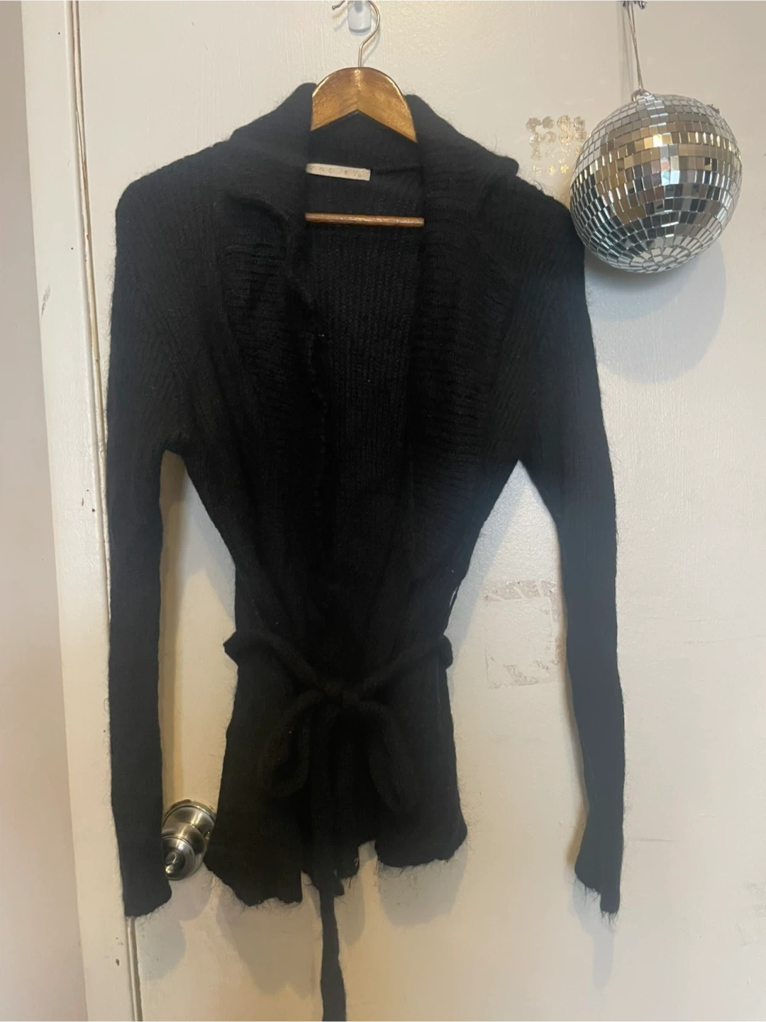Selling a cozy black knit cardigan! It has a tie around the waist. Great for layering or wearing on its own