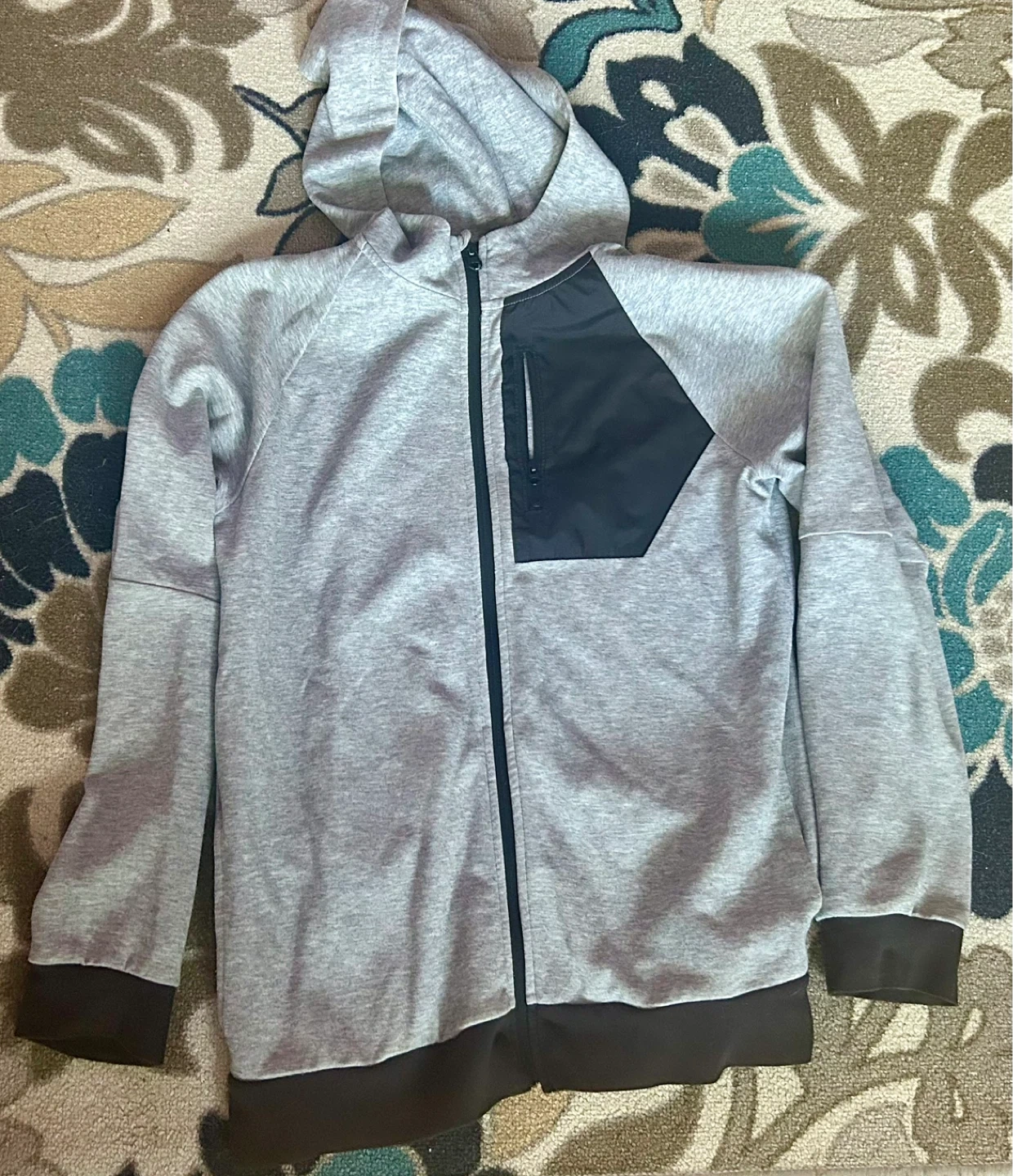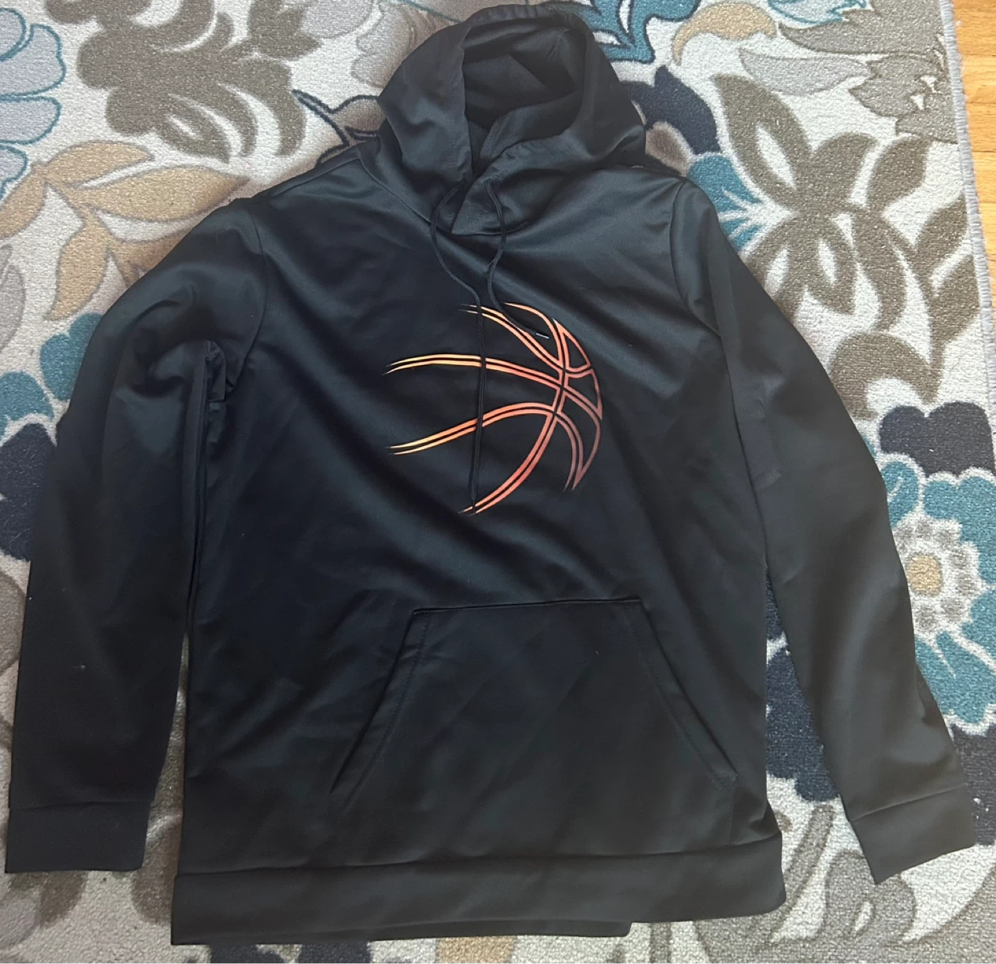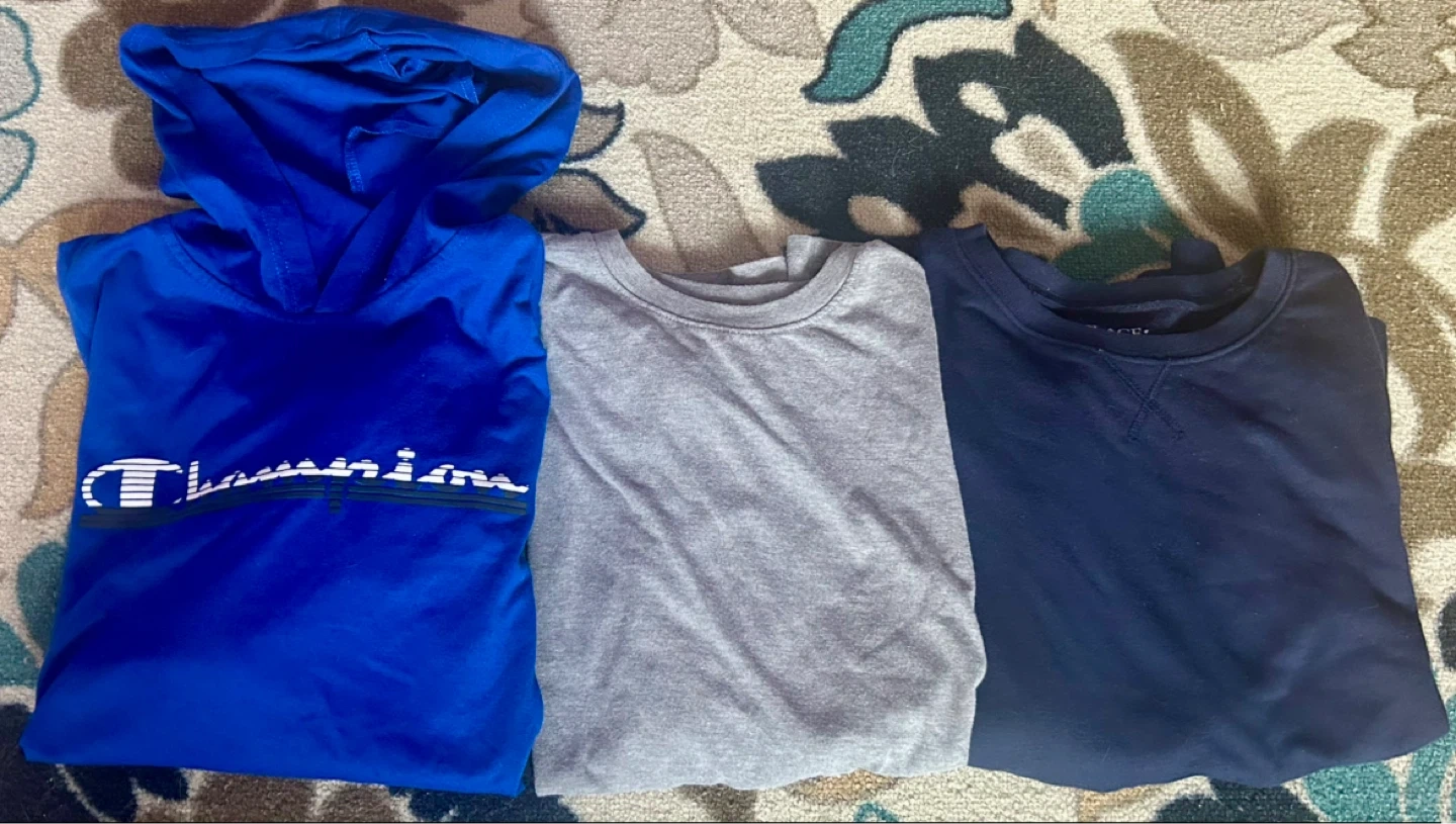 5 Gently used Bundle long sleeve includes a black hooded sweatshirt with a basketball graphic(size S ), a gray zip-up hoodie with a chest pocket(XL 14-16), a blue (14-16)Champion long sleeve with hoodie, a Cat & Jack (L 12-14)heather gray t-shirt, and a navy crew Chilldrens Place (XL-14)neck sweatshirt.