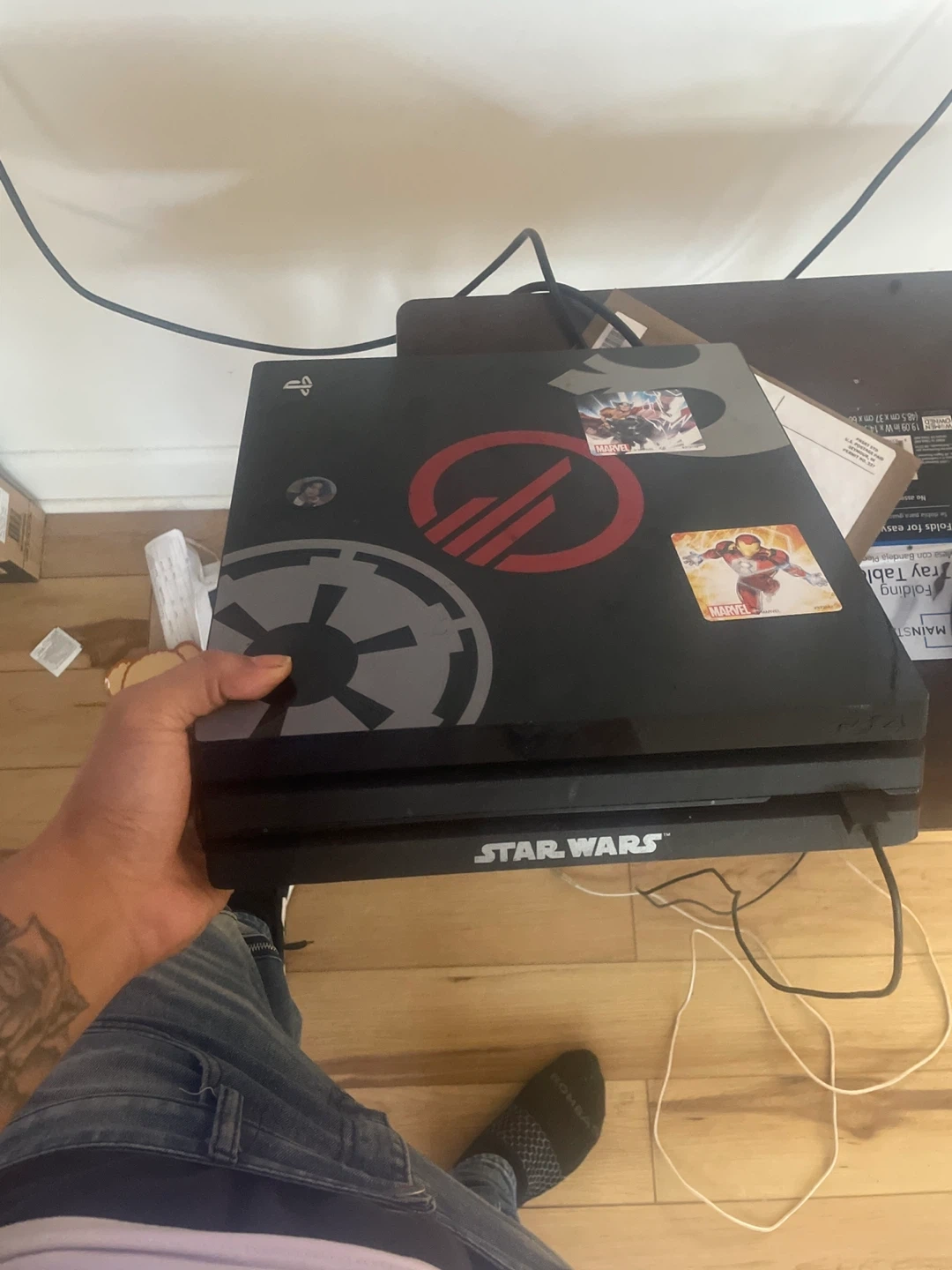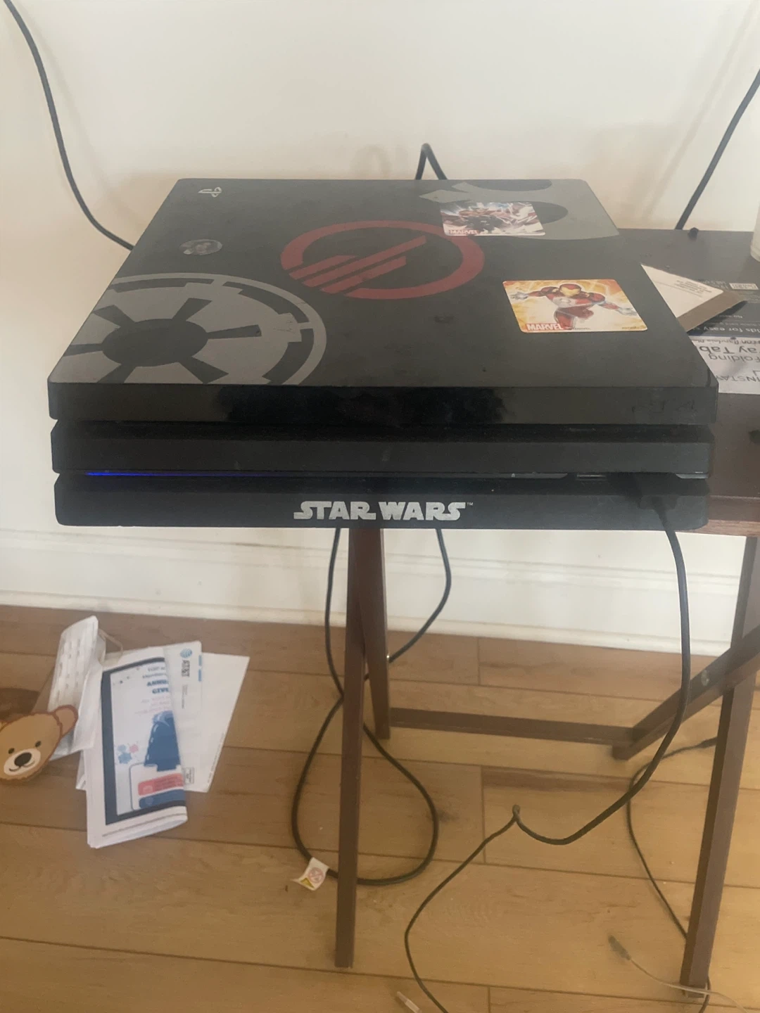 This is a PlayStation 4 Pro console with a Star Wars theme limited edition It features custom decals including the Galactic Empire and Mandalorian symbols. Includes one controller and games already on the console