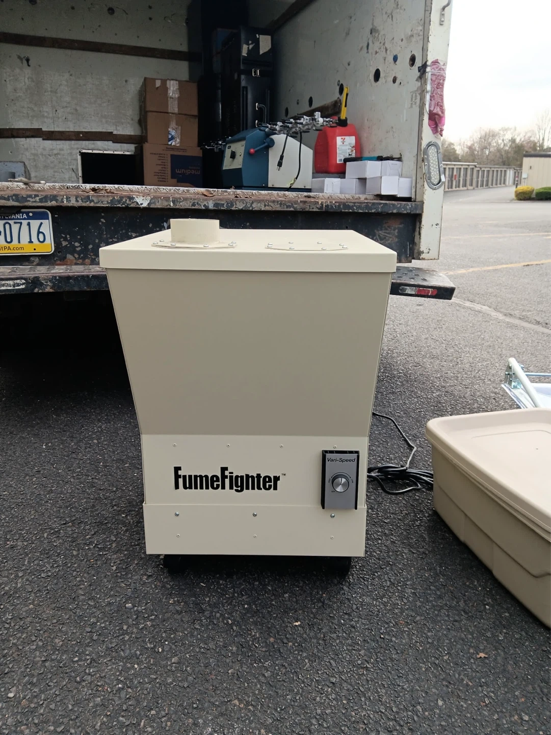 FumeFighter fume extractor unit. Features adjustable speed control. Includes ducting connection on top.