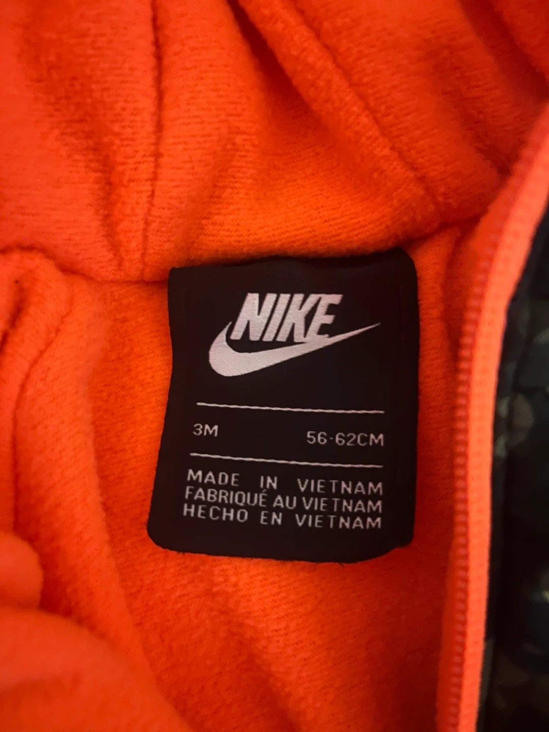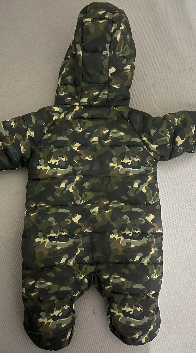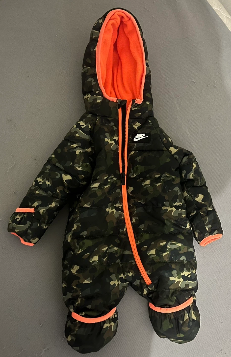 This is a Nike baby snowsuit. It's a camouflage design with bright orange trim and lining. Size is 3M (56-62CM).