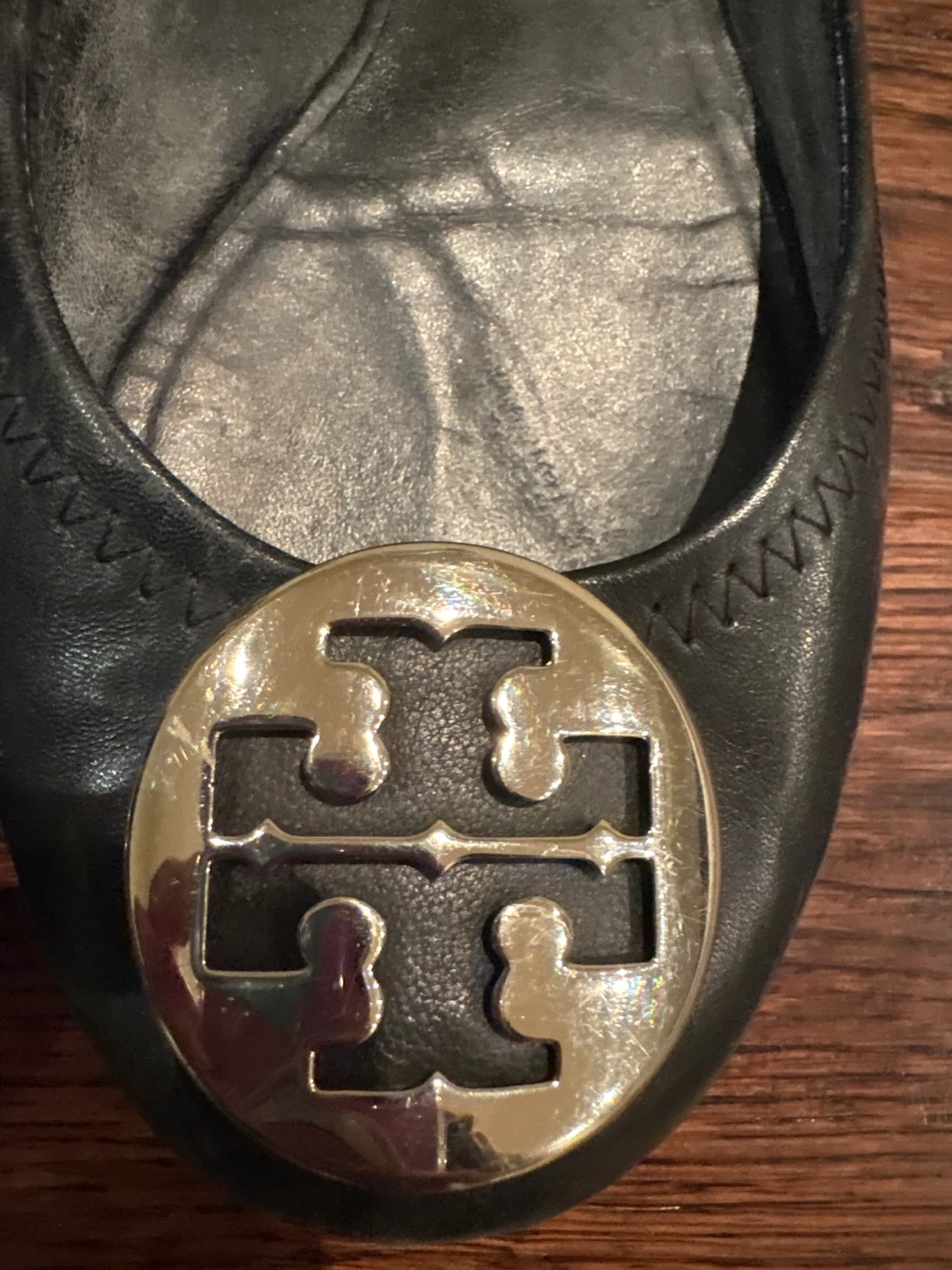 Black leather ballet flats from Tory Burch. Features a gold-tone double 'T' logo emblem. These shoes are designed for everyday wear.