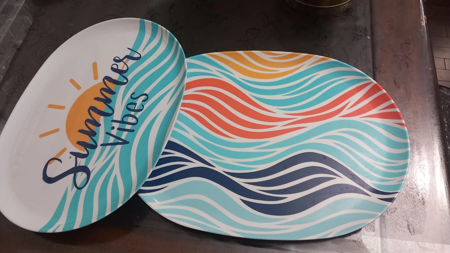 This set includes three oval plates with cheerful summer designs. The largest plate features a 'Summer Vibes' sun graphic, and the other two have wavy ocean-inspired patterns.